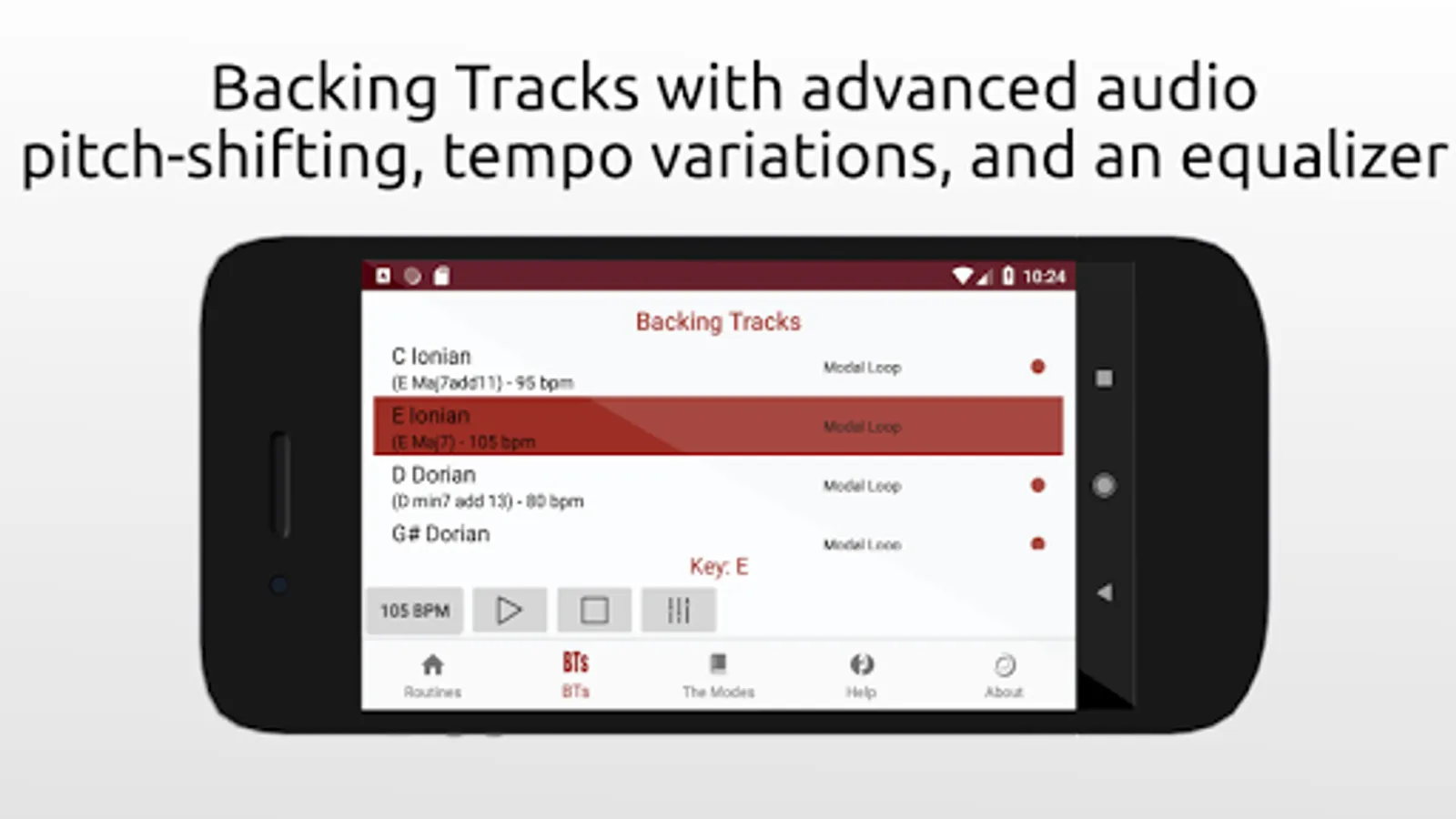- 14 Backing tracks/modal loops with advanced audio pitch-shifting, tempo variations, and an equalizer (this version has 7 free BTs)