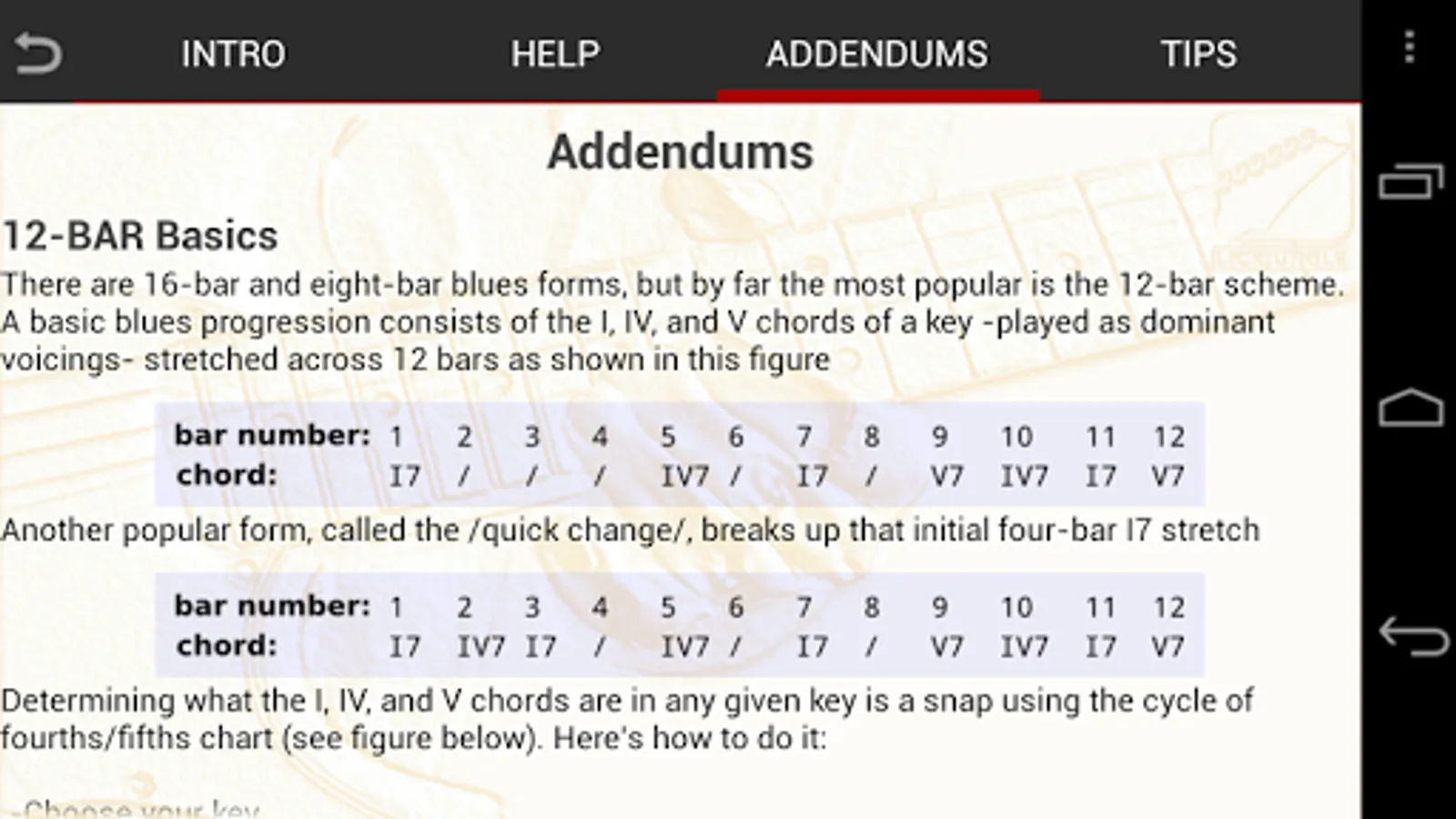 Ever ask another guitarist how to play a solo over a I-IV-V blues progression? Nine times out of ten, you'll be directed to play a minor-pentatonic box scale. Listen carefully to great blues guitar music, and you'll hear a secret: It's intervals, not scale patterns, that make the magic happen. In this app you will learn to play blues guitar in terms of harmonic color and intervals, instead of meandering through scale patterns, in the context of a full original 12-bar blues based on the styles of various blues masters, like B.B King, Buddy Guy or SRV, among others with licks, tabs, amazing high quality video and audio.