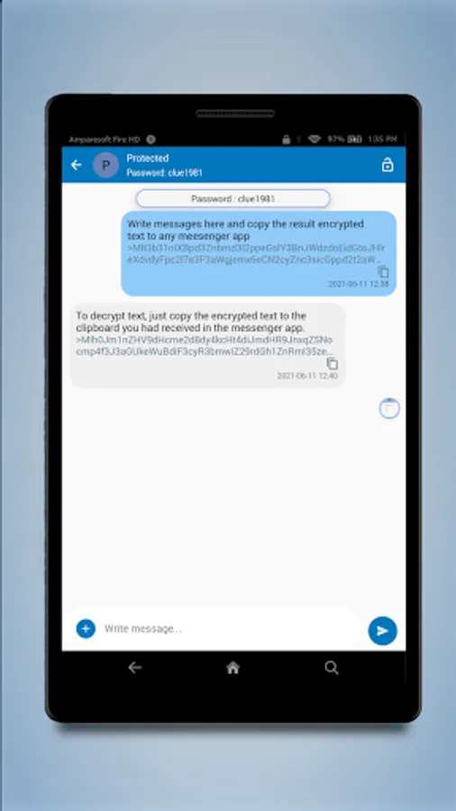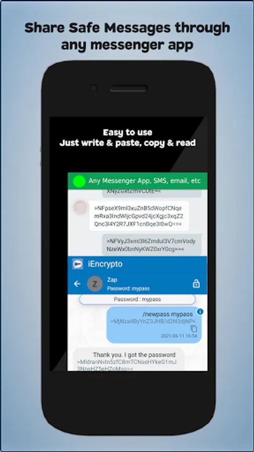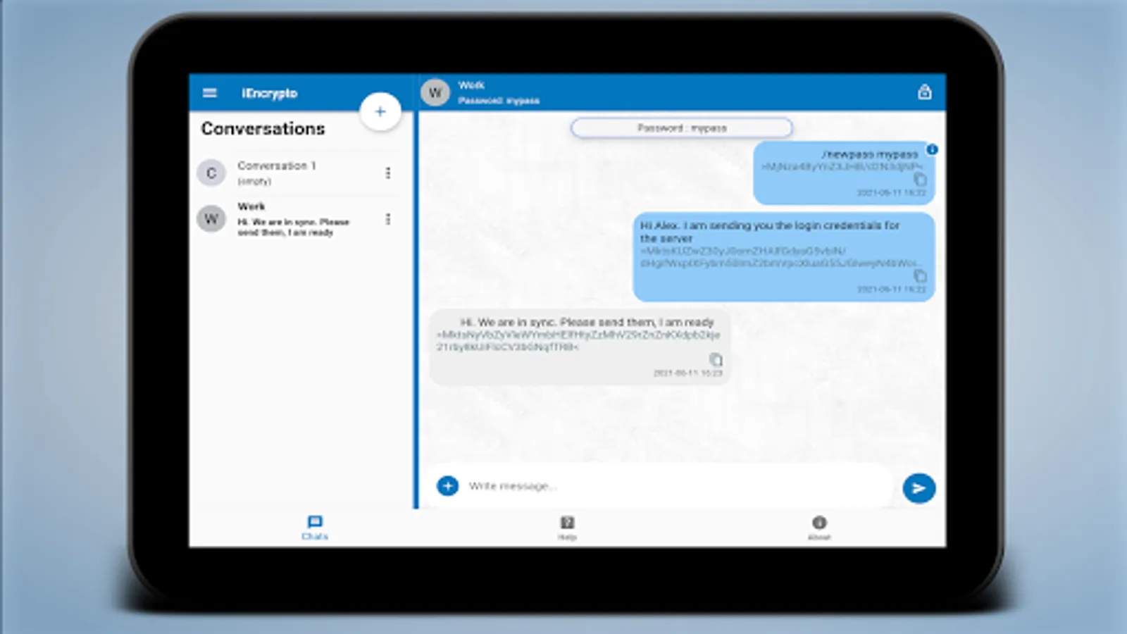 Write a message in iEncrypto; its encrypted version will be copied to the clipboard automatically. Open any messaging app and paste the encrypted message there. Wait for an encrypted answer in the messaging app, copy it to the clipboard, and then launch iEncrypto; the message will appear immediately.