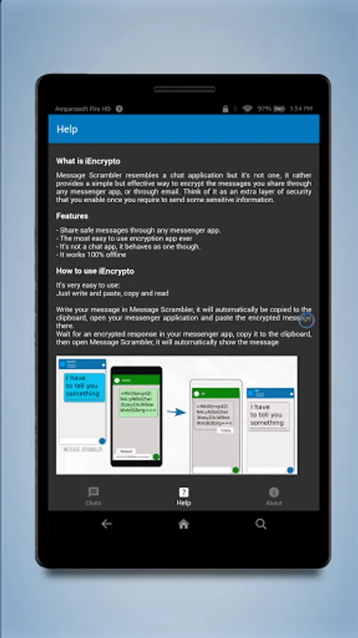 iEncrypto was designed for everyday users who want to send secret messages fast without knowing anything about cryptography. Its main purpose is to increase your privacy from the messenger's company/app. And for that purpose a simple "random" character reordering algorithm would have been kind of enough. That was too simplistic, so we went much further than that and implemented 4 encryption algorithms, which are: AmparoSoft’s own Message Scrambler, and AES CBC with 128/256 key length, Salsa20 and Fernet high security standards. iEncrypto auto detects the incoming message’s algorithm between these 4 keeping the user experience very simple.