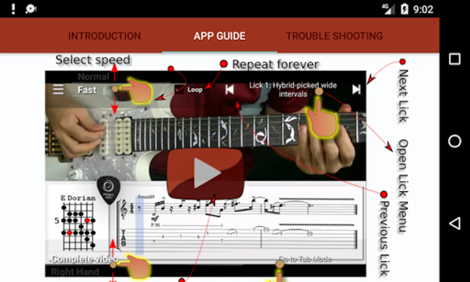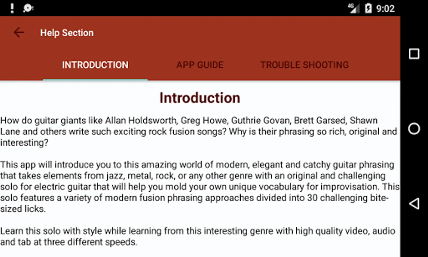 This app will introduce you to this amazing world of modern, elegant and catchy guitar phrasing that takes elements from jazz, metal, rock, or any other genre with an original and challenging solo for electric guitar that will help you mold your own unique vocabulary for improvisation. This guitar solo features a variety of modern fusion phrasing approaches divided into 30 challenging bite-sized licks, which facilitate the learning process.