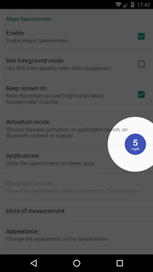 - Choose between miles, kilometers per hour or knots (mph, km/h or kn);