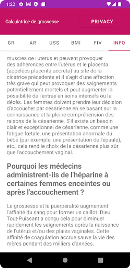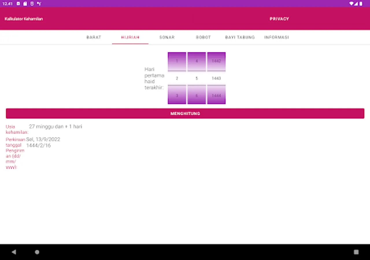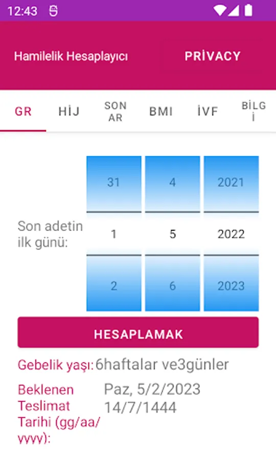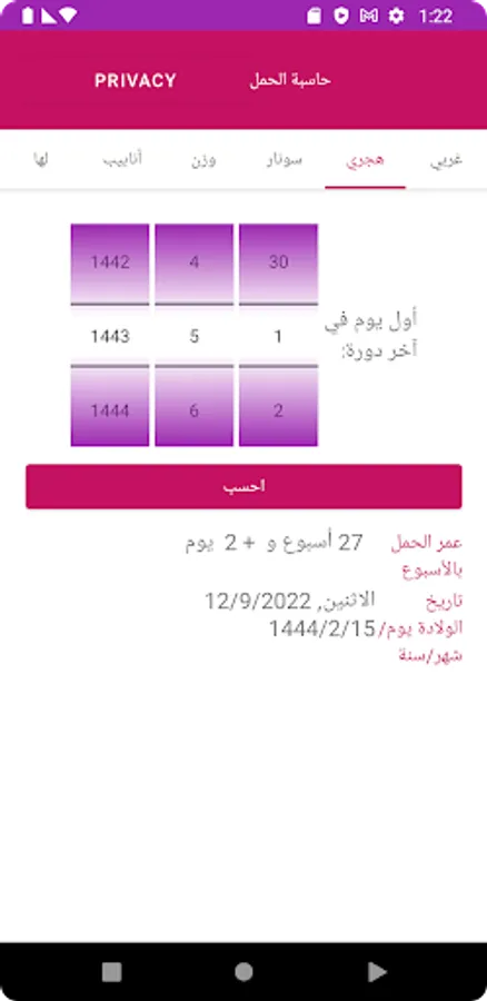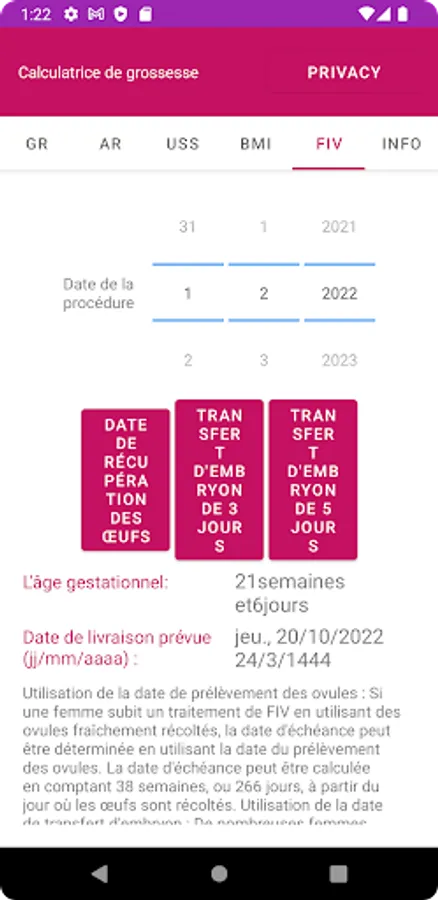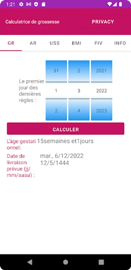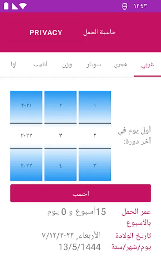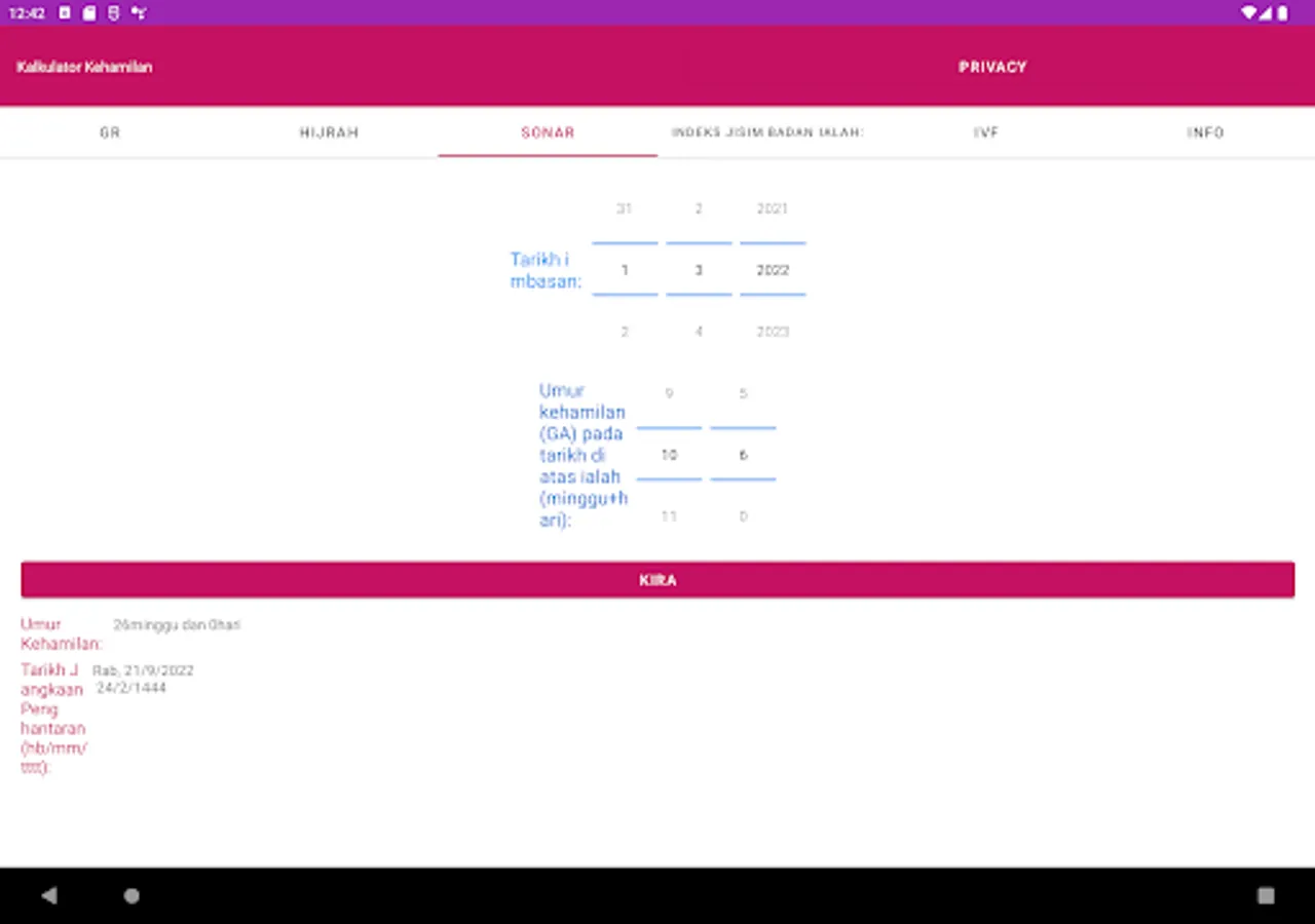 The app can calculate the Expected date of delivery (EDD) and Gestational Age (GA) based on Gregorian or Hijri dates. Also, it can calculate EDD based on a previous Ultrasound Scan (USS) or IVF procedure.