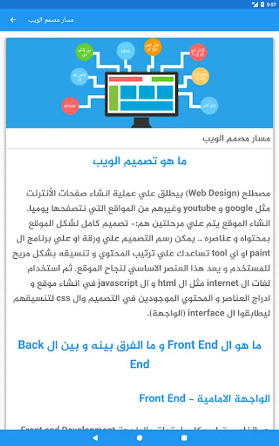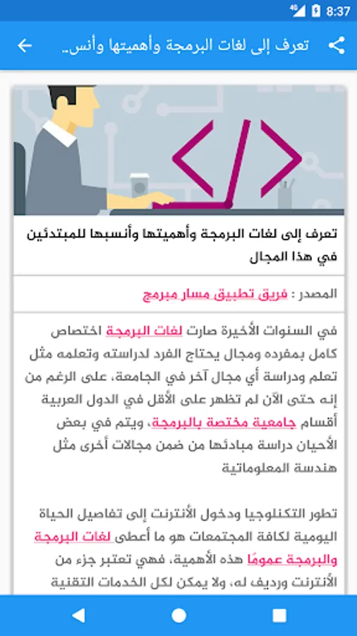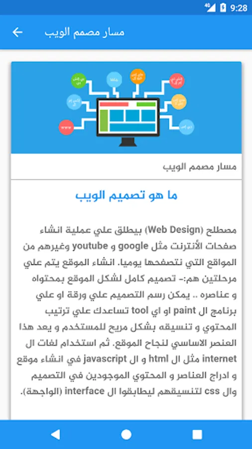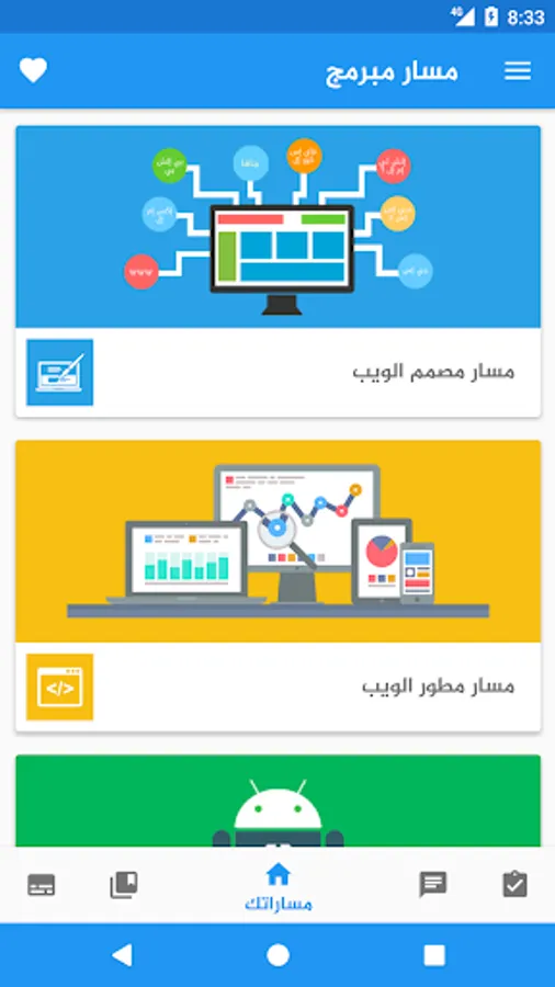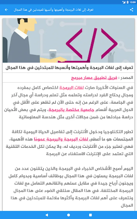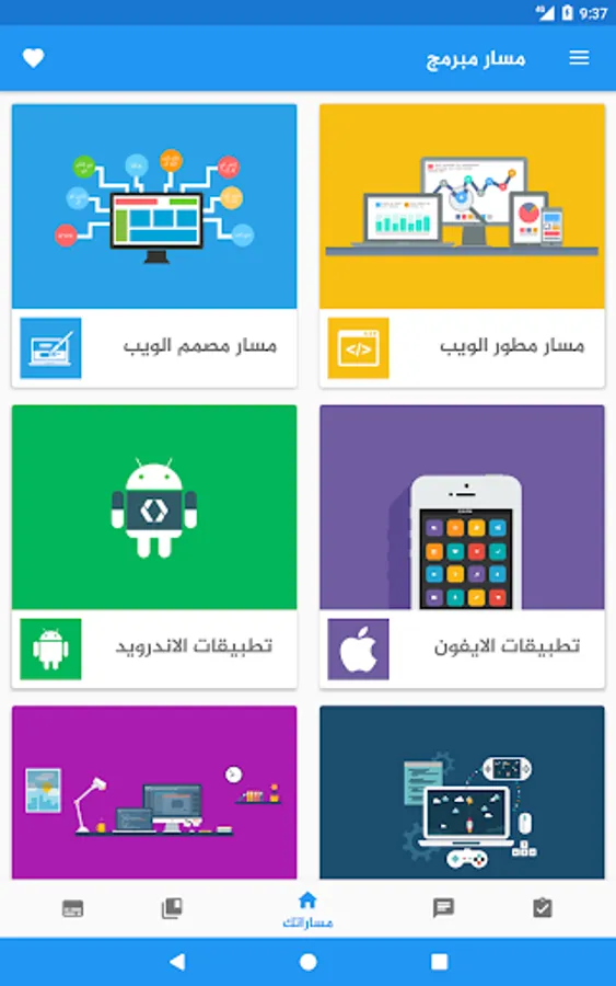 تطبيق مسار مبرمج التطبيق الاول عربيًا علي جوجل بلاي لتعليم البرمجة بالعربية مع مكتبة برمجية شاملة ، وقسم الاخبار لتحصل علي اخر الاخبار والمقالات التقنية في عالم البرمجة ، وشات يجمع بين المستخدمين شات لحظي محدث يمكنك منه إرسال صوره ، التطبييق صمم لتعليم البرمجة بالعربية ، حيث مهمة التطبيق هي تبسيط مسارات البرمجة ، وشرحها واعطائك افضل الكورسات المتوفره كما يمكنك ان تشاهد الكورسات من الهاتف مع متصفح التطبيق الذكي ، اذا كنت تريد تعلم برمجة الاندرويد كمثال فا يمكنك تحميل التطبيق والدخول علي قسم برمجة الاندرويد سوف يقوم التطبيق بشرح المسار لك كاملًا وسوف يوفر لك أفضل الكورسات، هدف التطبيق تبسيط لكم المعلومات حول لغات البرمجة ومجالاتها، يوجد بالتطبيق قائمة مساراتك اللتي يوجد بها مسارات البرمجة في وطنا العربي مثل :