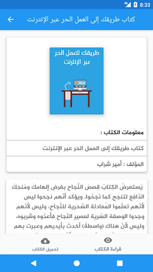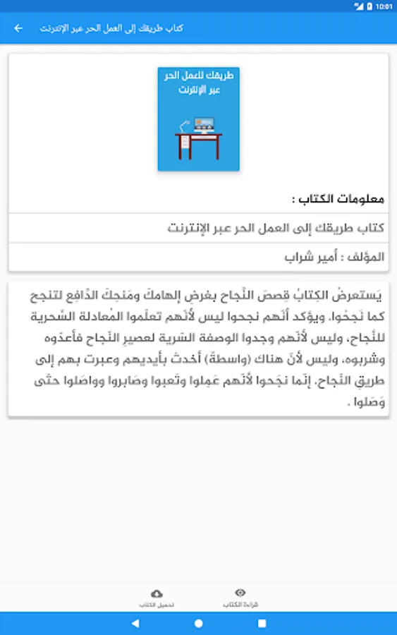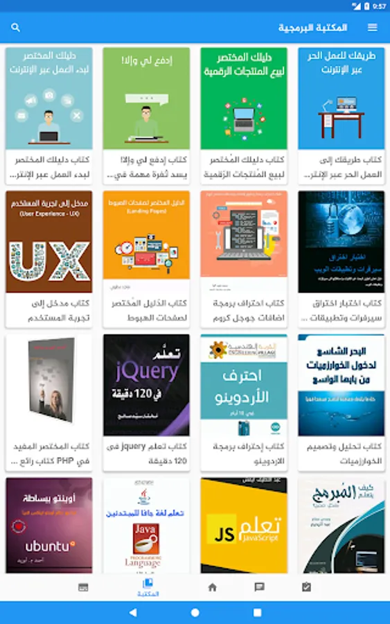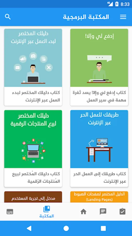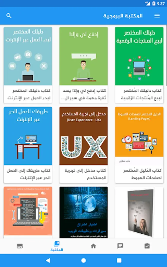 يتوفر تطبيق مسار مبرمج علي مكتبة برمجية شاملة مهمتها توفير الكتب المجانية في مجال تعلم البرمجة ، المكتبة البرمجية مربوطة بسيرفر أونلاين مما يعني انها سوف تحدث يوميًا وسوف يتم اضافة الكثير من الكتب يوميًا ، كما يمكنك تحميل الكتاب ، وايضًا يمكنك قراءة الكتاب في متصفح التطبيق الذكي ، يوجد ميزه البحث عن الكتب في التطبيق ، تم برمجة البحث للبحث عن وصف واسم الكتاب لتوفير الوقت عليك بالبحث عن الكتاب ، وسوف يتم اضافة كتب بشكل يومي وسوف تتوصلوا بإشعار فوري !
