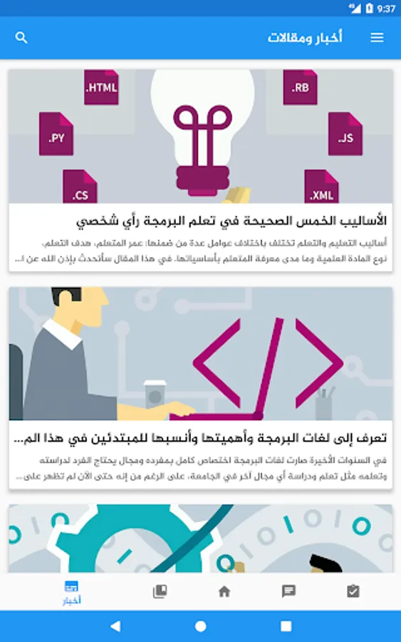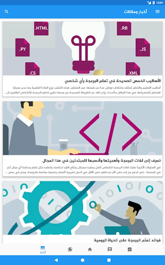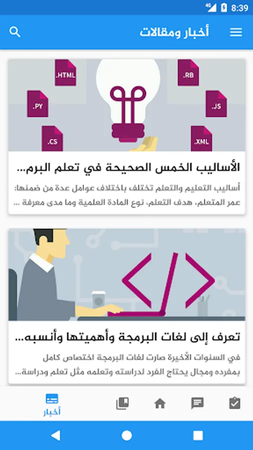 يتوفر التطبيق ايضًا علي أخبار ومقالات في عالم البرمجة ، فا في قسم اخبار ومقالات سوف تحصل علي أخر الاخبار والمقالات في عالم البرمجة ، مع طريقة عرض منظمة لتسهيل عليك قراءة المقالات يتم نشر مقالات بشكل يومي لانها ايضًا مربوطة بسيرفر أونلاين ، مما سوف توفر المساحة في التطبيق وايضًا لتحصل علي اخر الاخبار التقنية والمقالات في عالم البرمجة ، وتستطيع ايضًا البحث عن اي مقال باستخدام ايقونة البحث اللتي تم تصمميها وبرمجة هذا الزر بجودة عالية حيث يتم البحث عن وصف واسم المقالة مما يعني سوف يظهر لك المقالات بسرعة وبدقة !