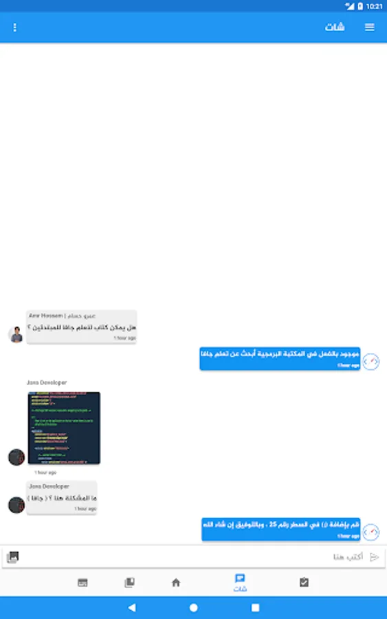 يتوفر التطبيق علي شات ، تُعد من أهم المميزات في التطبيق هو شات يجمع بين المستخدمين يمكنك منة إرسال صورة وهو شات محدث لحظيًا بين المستخدمين ، تستطيع الدخول بإستخدام اكونت جوجل وهذا فقط للحفاظ علي جوده المحادثات ، يمكننا مساعدتك في اي شئ ويمكنك التحدث معنا ومع المستخدمين في الشات ، متواجدين 24 ساعة يوميًا