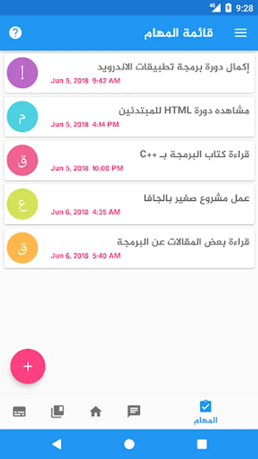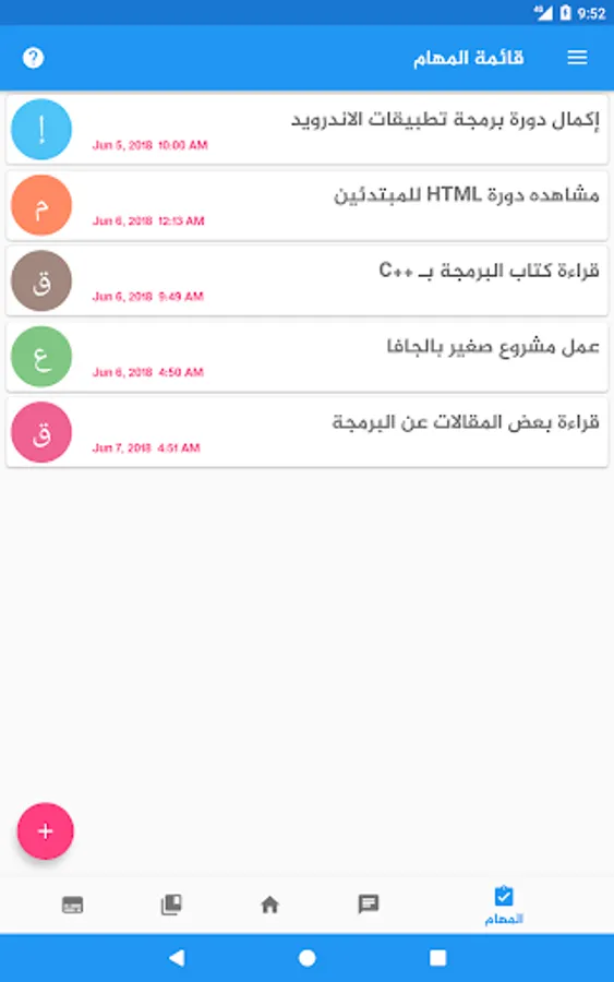 يتوفر التطبيق ايضًا علي قائمة المهام ، حيث سوف تستطيع منها تنظيم مهامك كمبرمج مستقبلي ، مثل قراءة كتاب في المكتبة البرمجية او مشاهدة كورسات للبرمجة مع التنبية ، اذا فعلت وضع التنبية سوف يتم اشعار لك بالضغط عليه يمكنك مسح المهمة