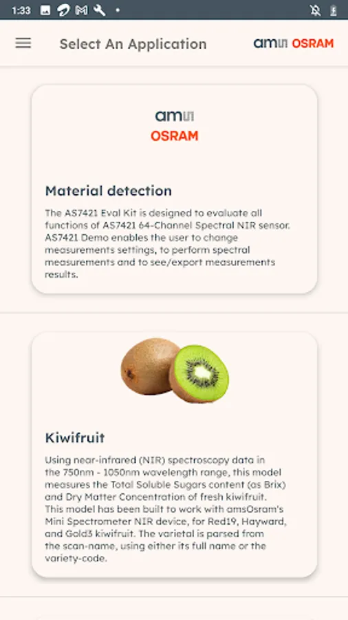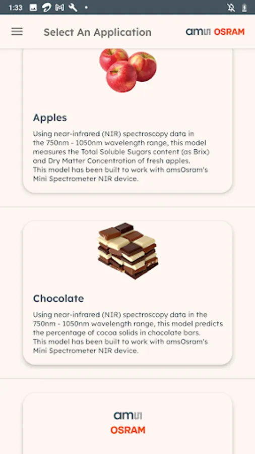 - Included chemometric models for BRIX (sweetness/tartness), Dry Matter (firmness/freshness) in Apples/Kiwi fruits & cocoa quantification of chocolate bars.