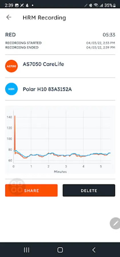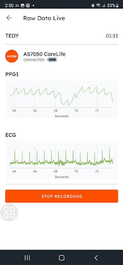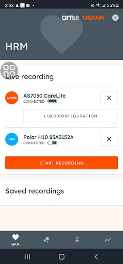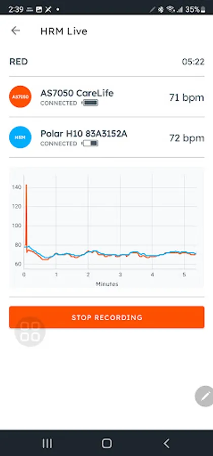 In the HRM view, the user can monitor the plot and record the heart rate results for further analysis.
