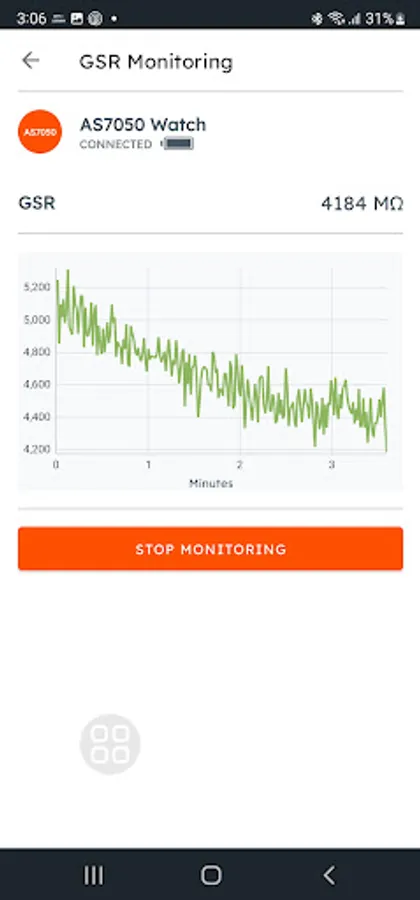 GSR Monitoring: This sub-application displays the user's real-time Galvanic skin resistance (GST)values and line plot over time.