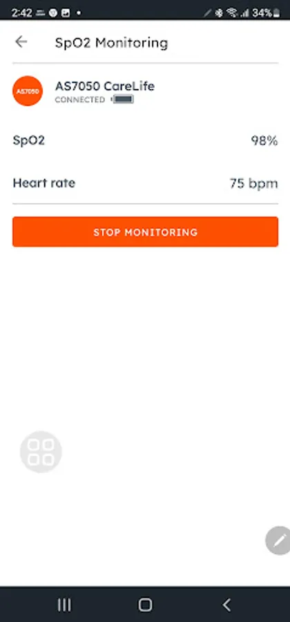 SpO2 Monitoring: Blood oxygen saturation level (SpO2) measures the amount of oxygen carried in the haemoglobin. SpO2 is expressed as a percentage of the maximum amount of oxygen that haemoglobin in the blood can carry. In this view, the application allows the user to measure and display the pulse rate while measuring the SpO2 levels.