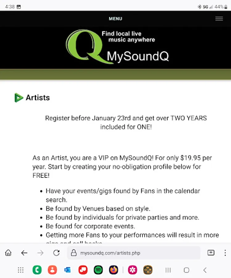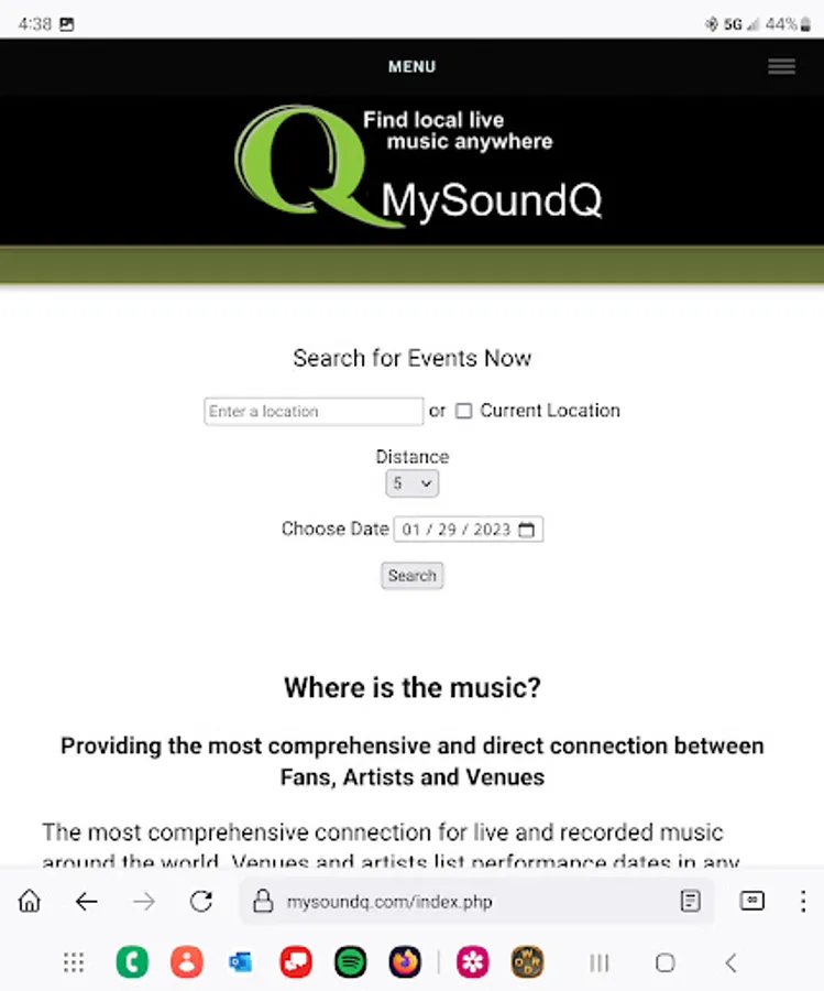 At MySoundQ, our mission is to bring live music back to life by providing you with the most comprehensive and direct connection between Fans, Artists and Venues. Whether you are local or traveling, find music happening anywhere. All users will be able to browse the "Q" for posts and important updates from both Artists and Venues. Artists and Venues can list performance dates in any music style on an efficient and user-friendly calendar. Artists can upload demos, recordings, and videos that can be viewed and listened to by Venues and Fans. Fans can find their favorite entertainment anywhere by search date, location and style of music, whether a Live Band, Solo Artist, DJ or Karaoke. Finally, one place to find it all!