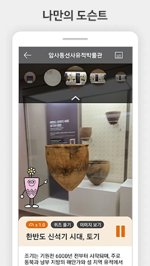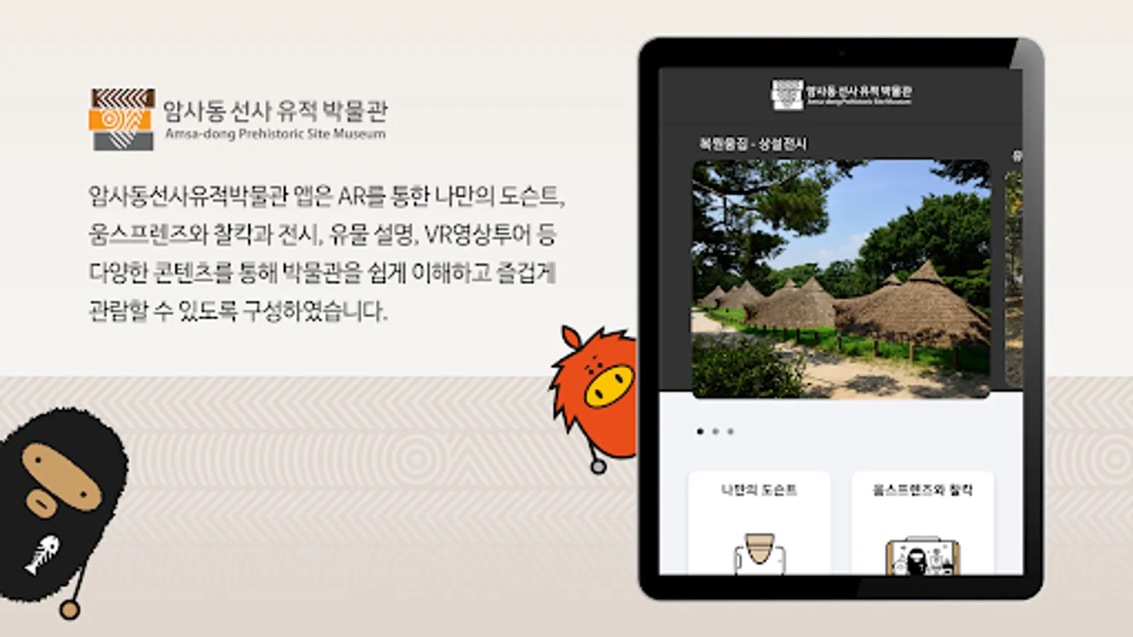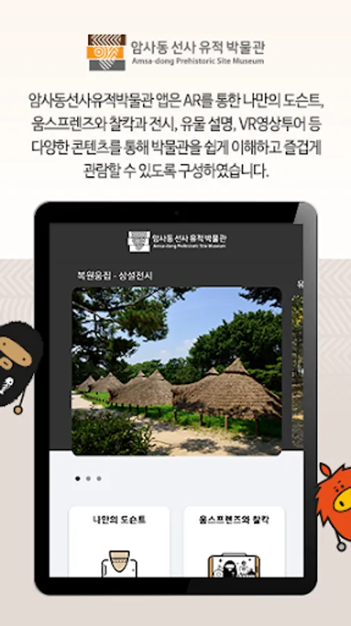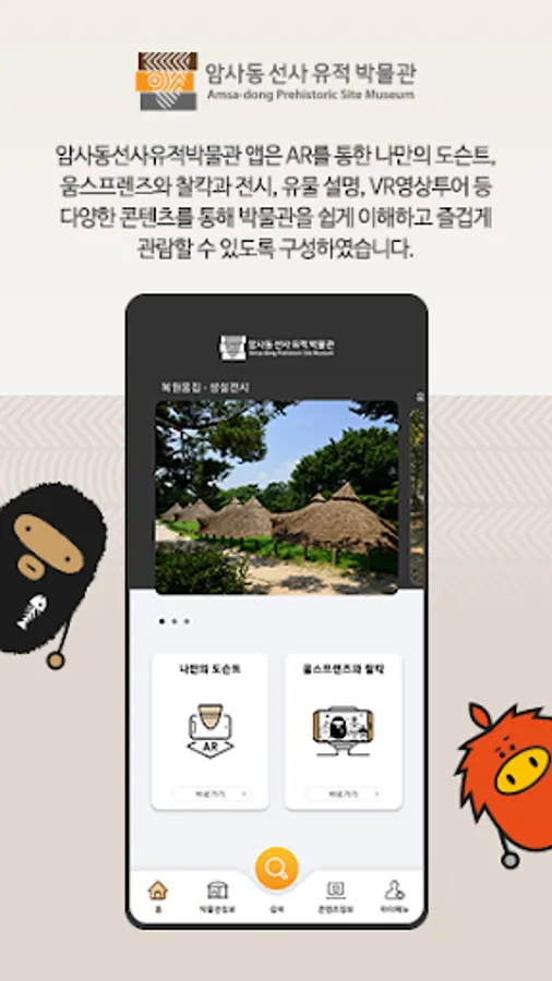 - Easily understand the life history of prehistoric people who lived in Amsa-dong through realistic artifact AR, images and videos through your own docent tour explained by Bitto, take quizzes, and collect Um's Friends cards! You can easily and fun understand the Amsa-dong Prehistoric Museum with Wooms Friends.