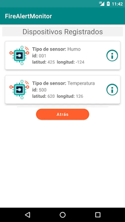 Mobile application that can display the temperature, humidity, smoke and quality of life for each registered section of the forest. In addition, you can receive an alert and show on the map the location of the device that detected the fire.