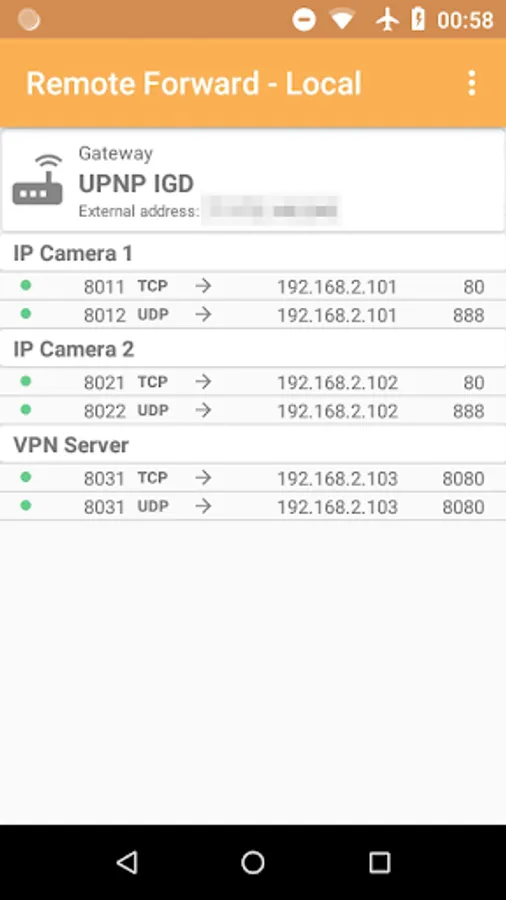 Remote Forward helps you manage UPNP port mappings in your router or gateway from any location, at any time. Getting this way access to devices in your home or office while minimizing exposure to external attacks by enabling port forwarding only when you are about to establish a connection.