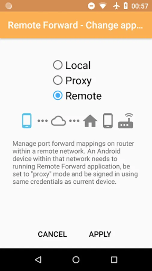 - Proxy: device works as a bridge between your main device running Remote Forward and your router or gateway. Communication between the two Android devices occurs via our servers.