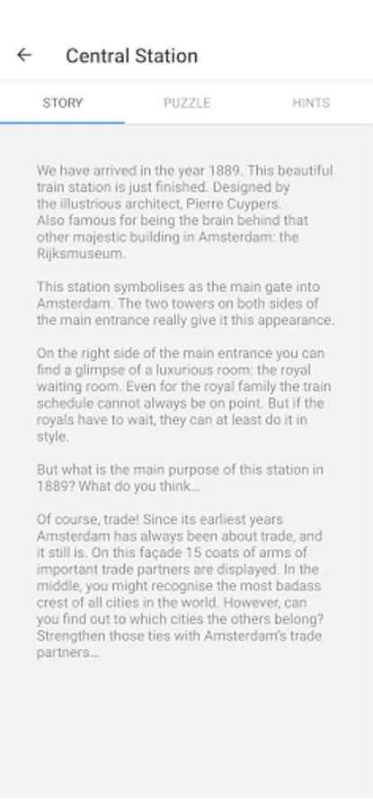 Visit the locations that are shown on the map. Solve the puzzle by using your surroundings and learn about the history of different land marks. Using the app is a lot of fun and at the same time you will learn a lot about the city.