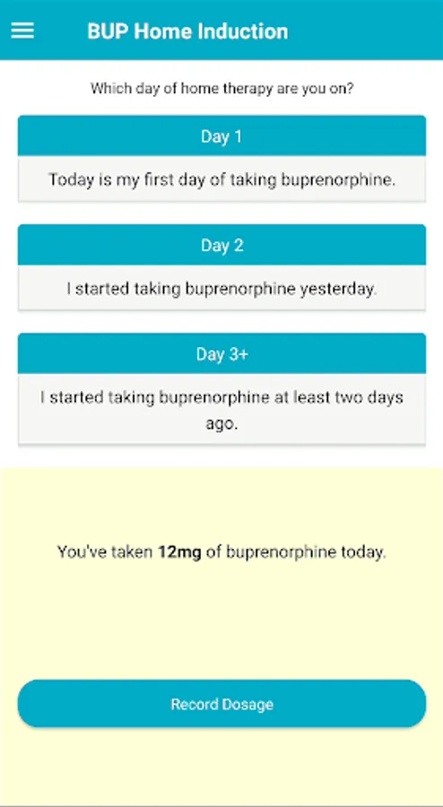 Buprenorphine Home Induction Tool (BUP) is an informative mobile application that guides patients on how to conduct Buprenorphine induction using a series of questions that the patient is asked in the mobile application.