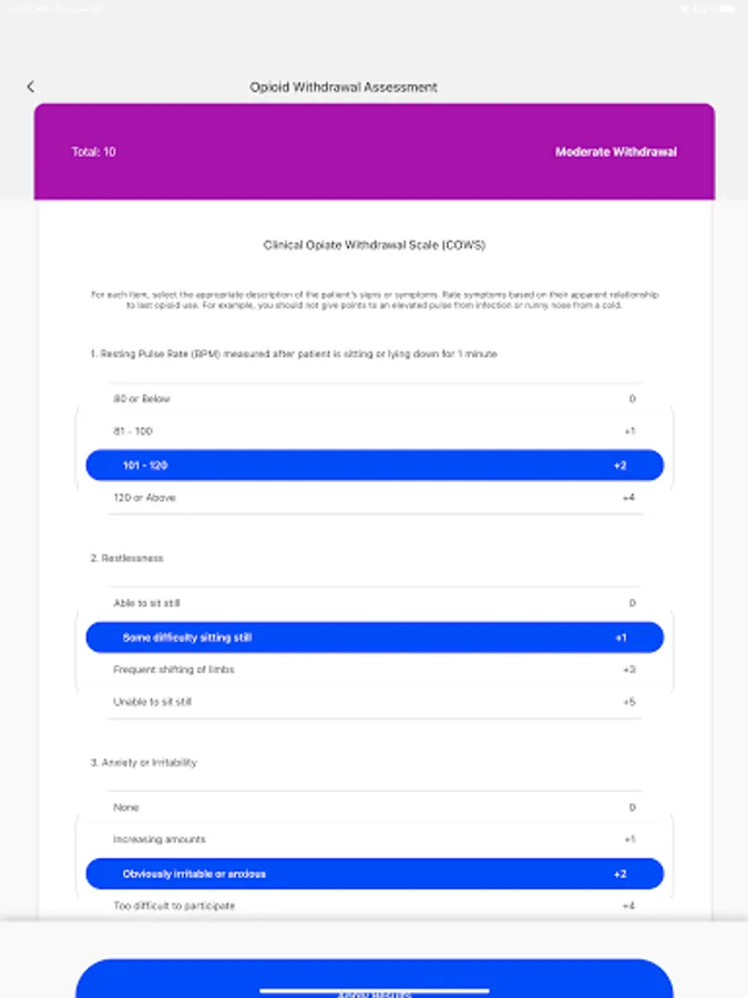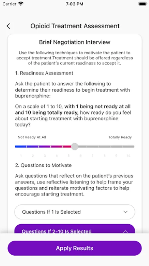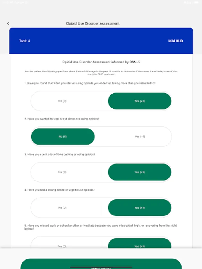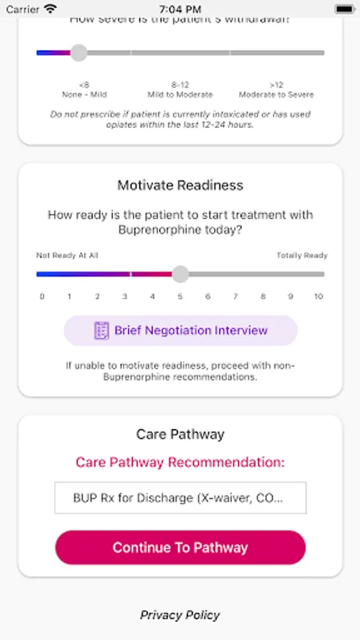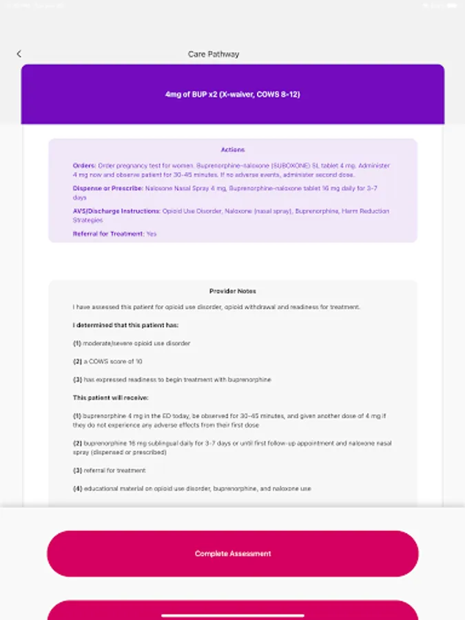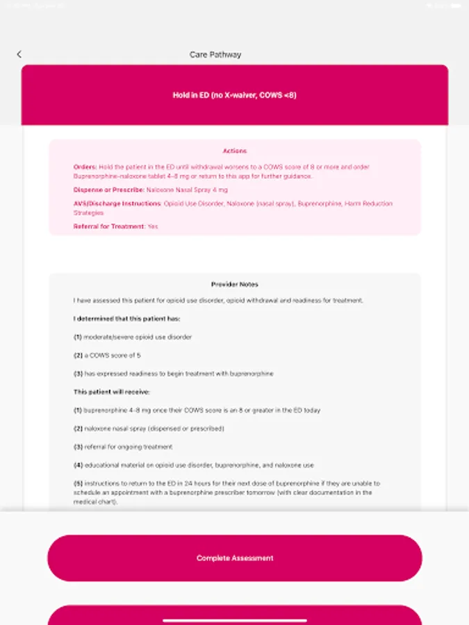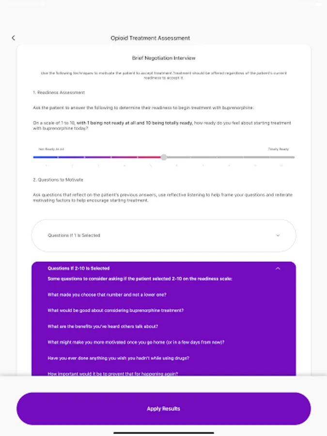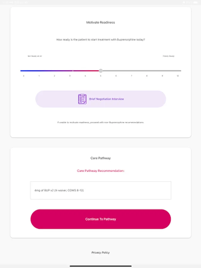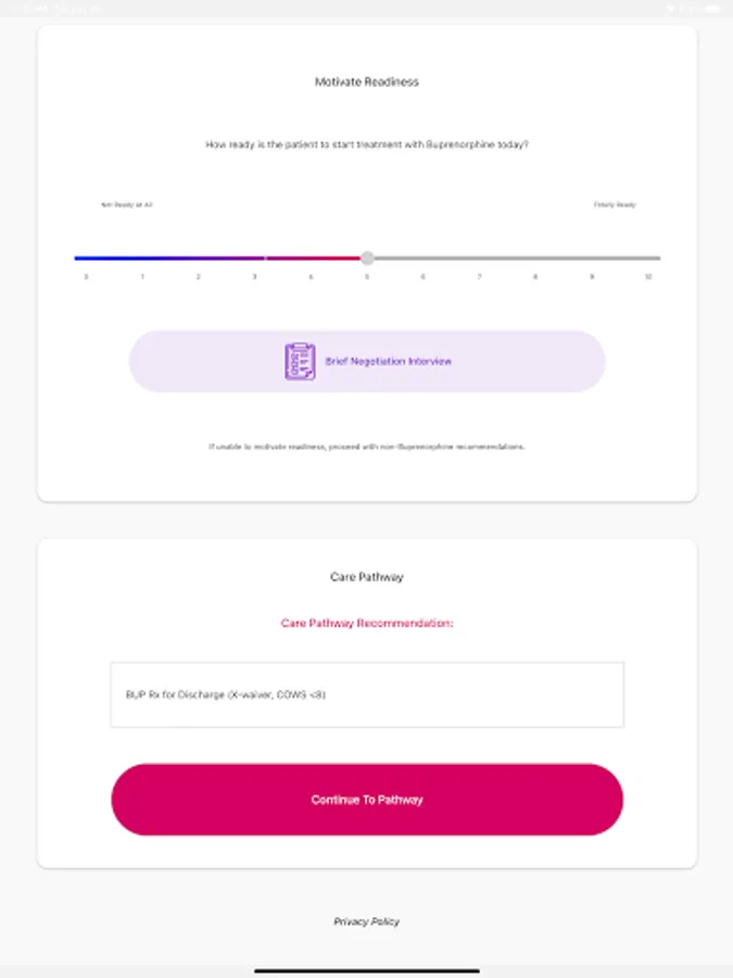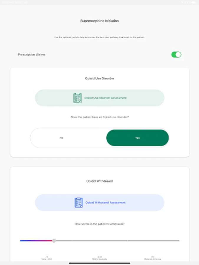 The Buprenorphine (BUP) Initiation app is an informative mobile application that guides healthcare professionals on how to initiate treatment with Buprenorphine in the emergency department (or other acute care setting) using a series of assessment tools and a brief negotiation interview.