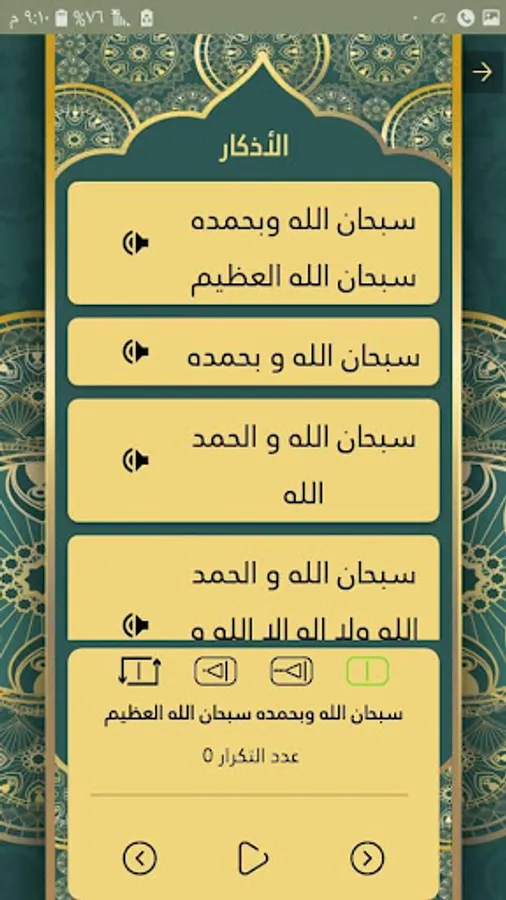 - يمكنك تشغيل الذكر مائة مرة وينتقل إلى التالي ؛ أو الف مرة وينتقل الى التالي