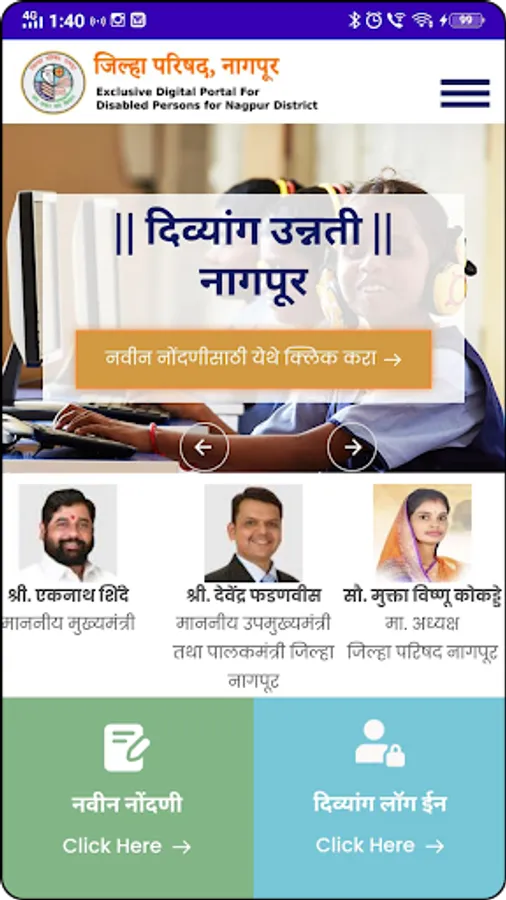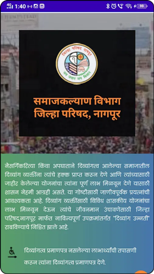The Government always insists on ensuring that the disabled persons of society who are handicapped naturally or by accident get their rights and get the full benefit of the schemes announced for them. This requires conscious effort. It has been decided to implement "Divyang Unnati" through Zilla Parishad, Nagpur as an innovative initiative to improve the standard of living of differently-abled persons by getting them benefit from various government schemes.