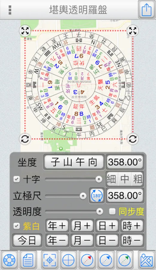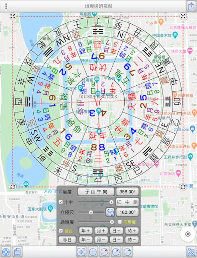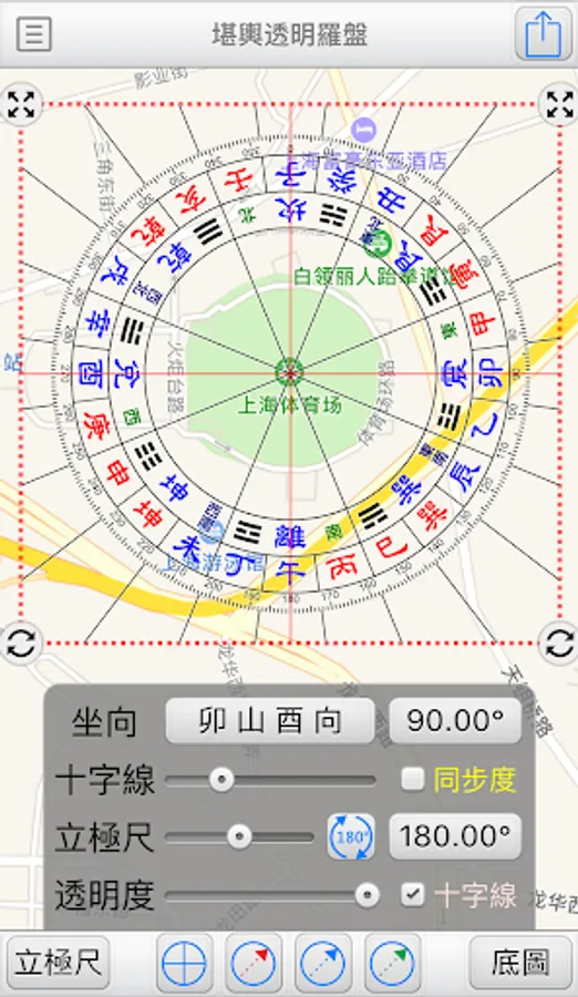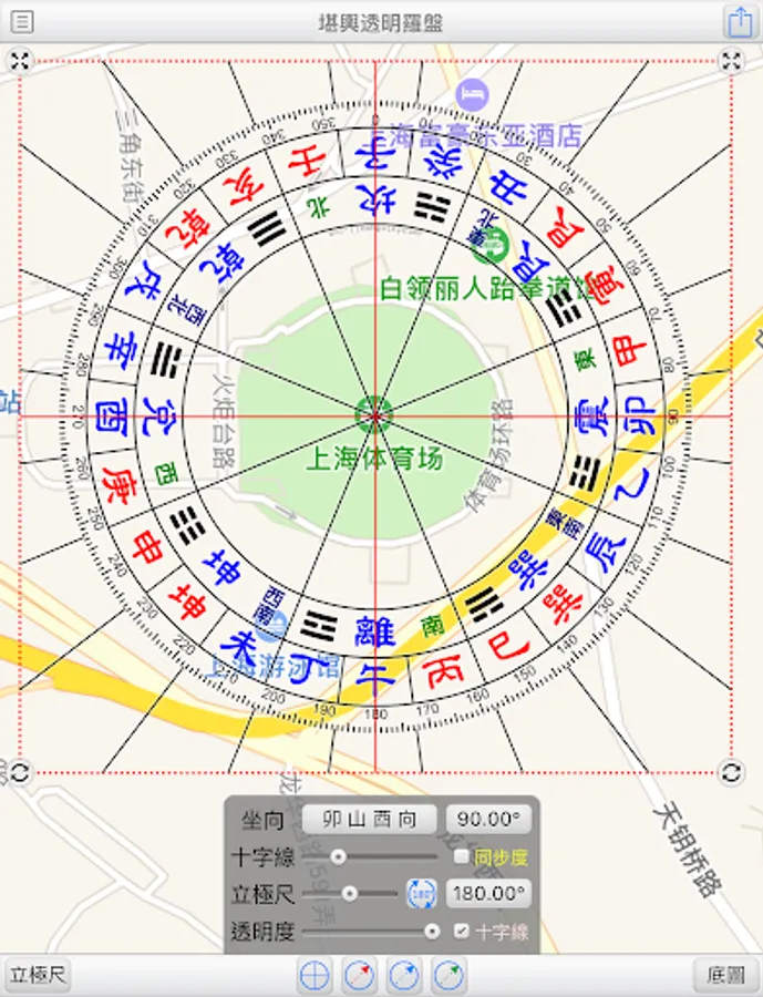 ●Adjust the degree of "Pole Ruler" and "Cross Line" to match the sitting direction of the house in the base map. (Note: When using the map, the azimuth will be automatically set to the sub-direction of Wushan Mountain, just adjust the direction of the crosshairs.)
