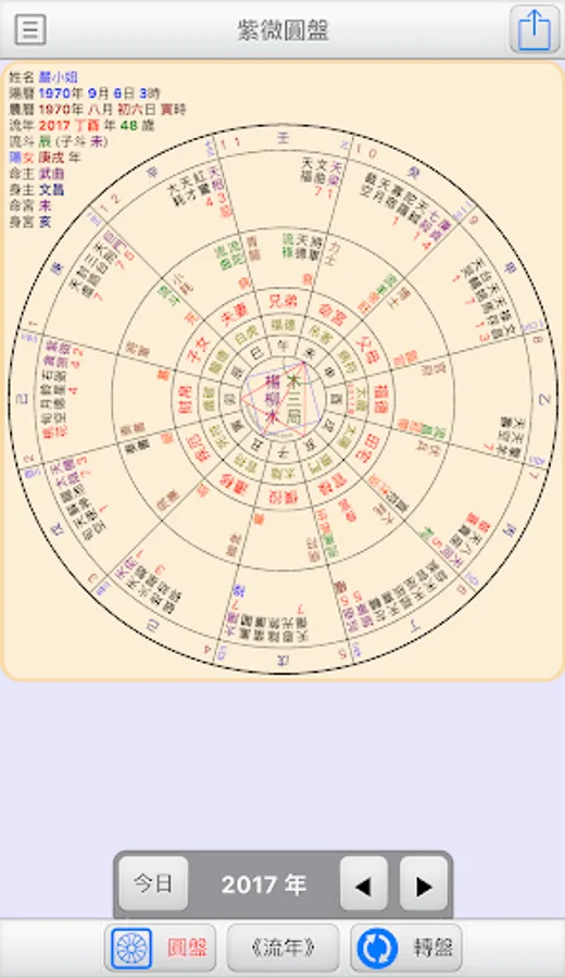 ●Turntable: Simple Ziwei Doushu round natal chart, providing:
