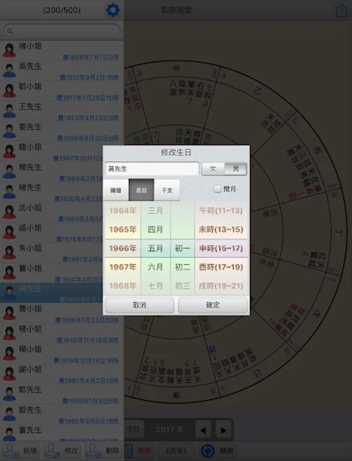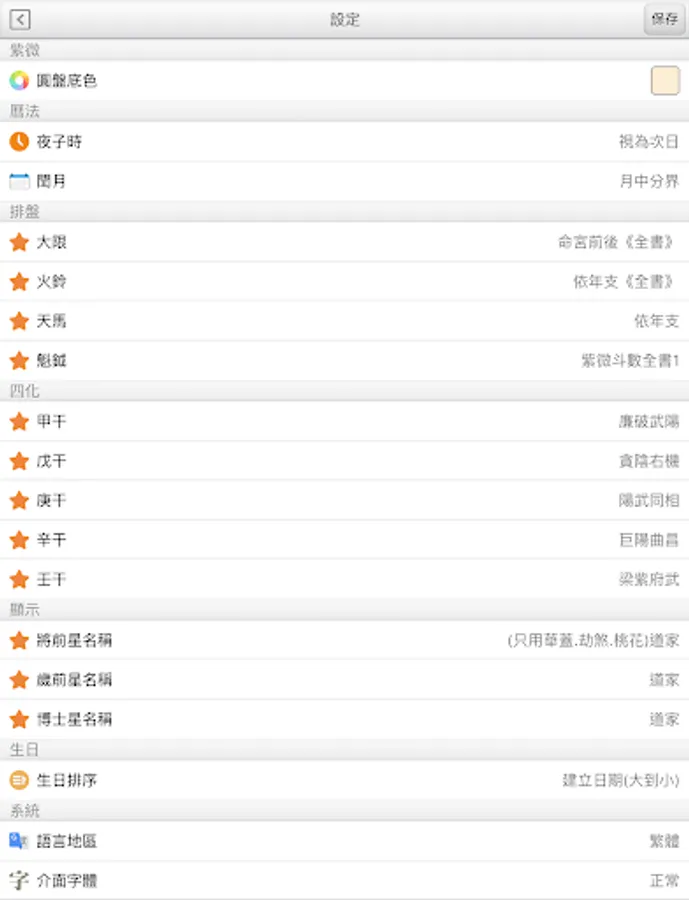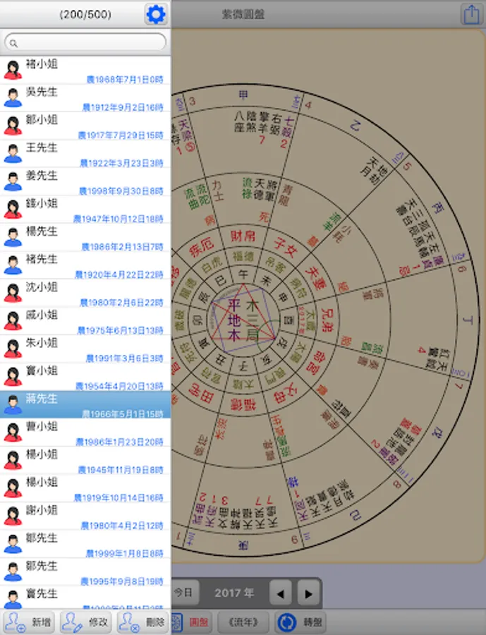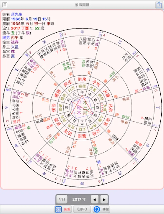 ●Plate: Contains the Ziwei Doushu round natal chart, name, date of birth, Gregorian and Lunar calendar, fleeting years, life master, life body palace... etc. It provides two-finger zooming and pressing to restore the size.