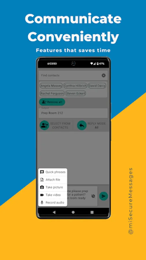 miSecureMessages is a secure, two-way instant smartphone and tablet messaging Android™ App that uses encryption to keep your messages private. Messages can be sent securely from device to device, and by using the secure cloud-based or on-site directory solution. When you receive a message from miSecureMessages, a Persistent Alert notifies you until you acknowledge the message. You can view the message, and quickly send a secure reply. miSecureMessages is perfect for healthcare and medical professionals to protect patient PHI, as well as industries that need secure instant messaging. For more information, contact AMTELCO at 800-356-9148 or e-mail support@misecuremessages.com.