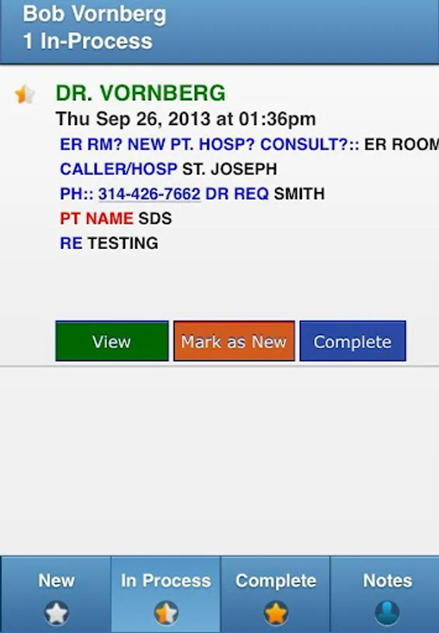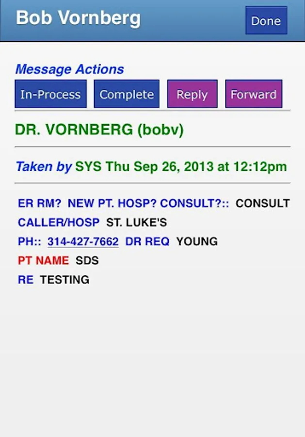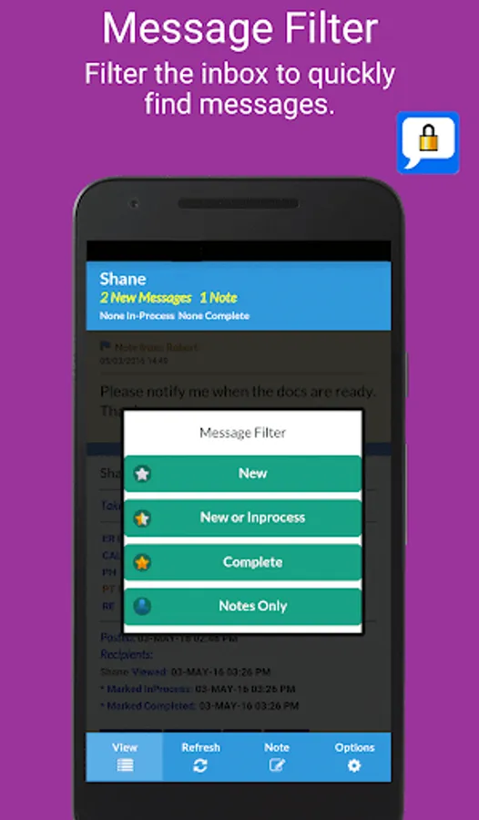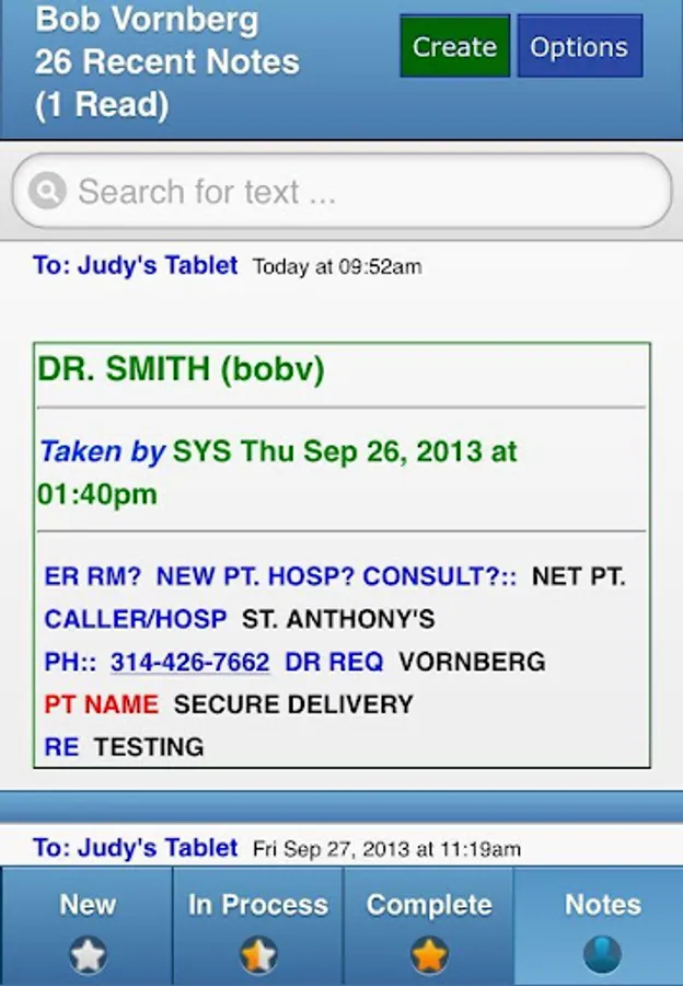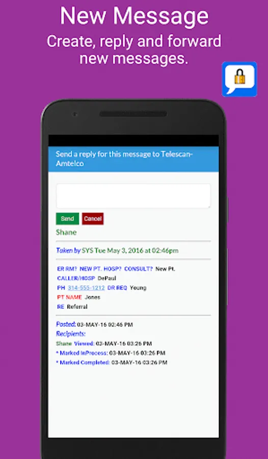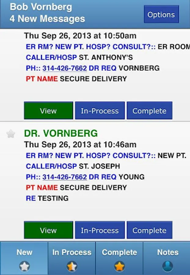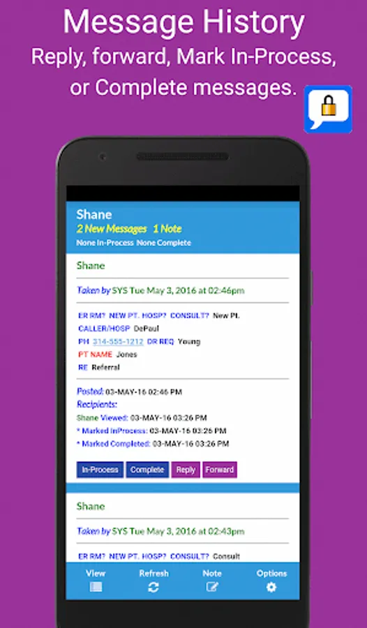 Spectrum Secure Delivery secures PHI by protecting access with a configurable passcode, encrypting the transmission of data and not storing data on the phone or tablet. When a messages is received the user can Reply, Forward, mark In-Process, or Completed. The inbox can be filtered to display all messages, new, new or in process, complete and notes with the message filter. The message history is displayed below the message for all message recipients.