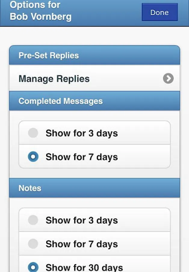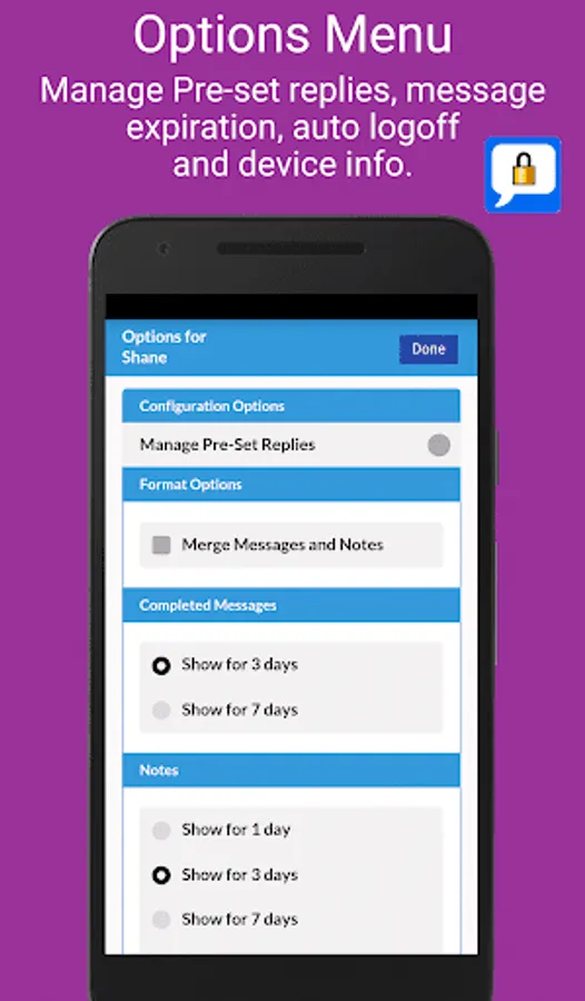 Manage the application settings from the Options tab for a custom secure messaging experience. Create a library of Pre-Set custom replies and notes to speed up the messaging process. Reduce load times by setting an expiration for completed messages and adjust the auto-logoff settings to increase security.
