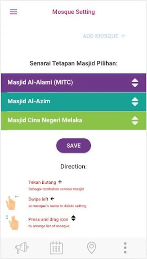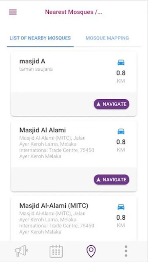 Maklumat berkenaan aktiviti / program akan dipaparkan halaman setiap masjid yang dipaparkan. Aplikasi ini juga digunakan bagi mencari atau melihat taburan masjid dan surau disekitar negeri Melaka.