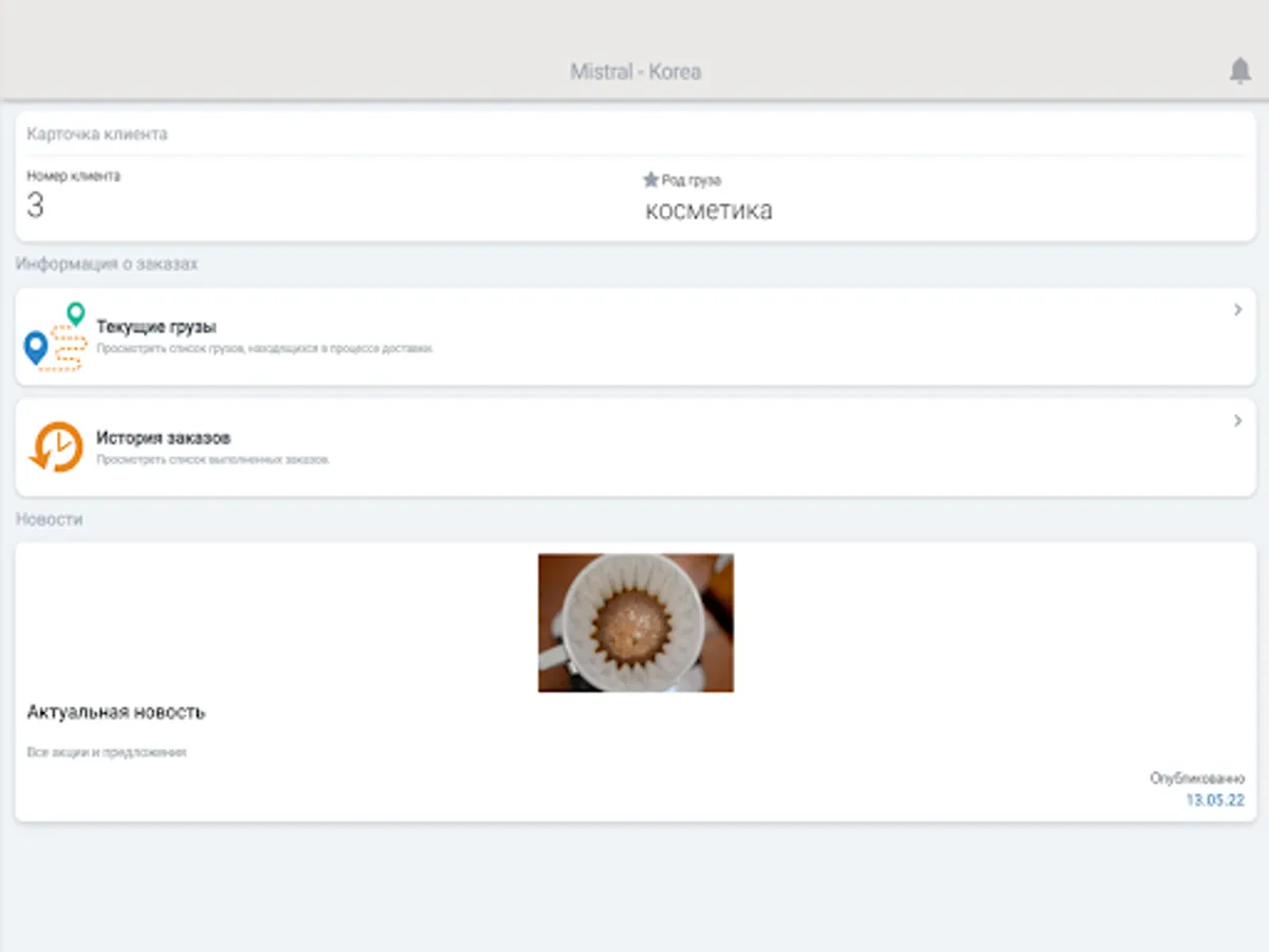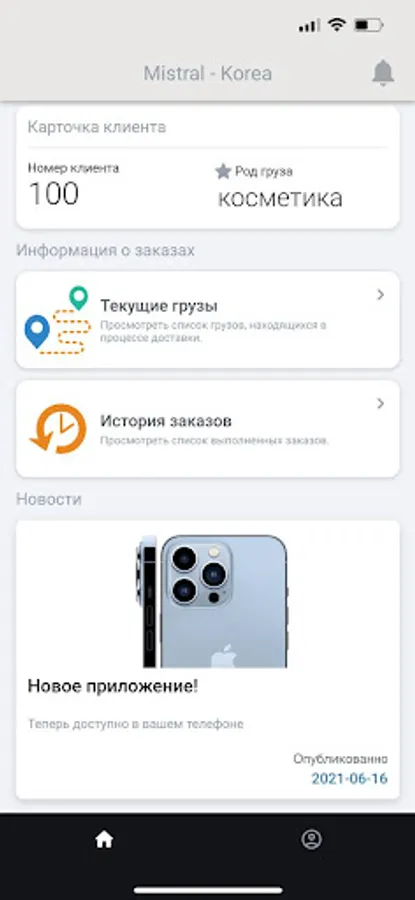 Application for clients of the company "Mistral - Korea", The functionality of the program allows you to track the shipped cargo.