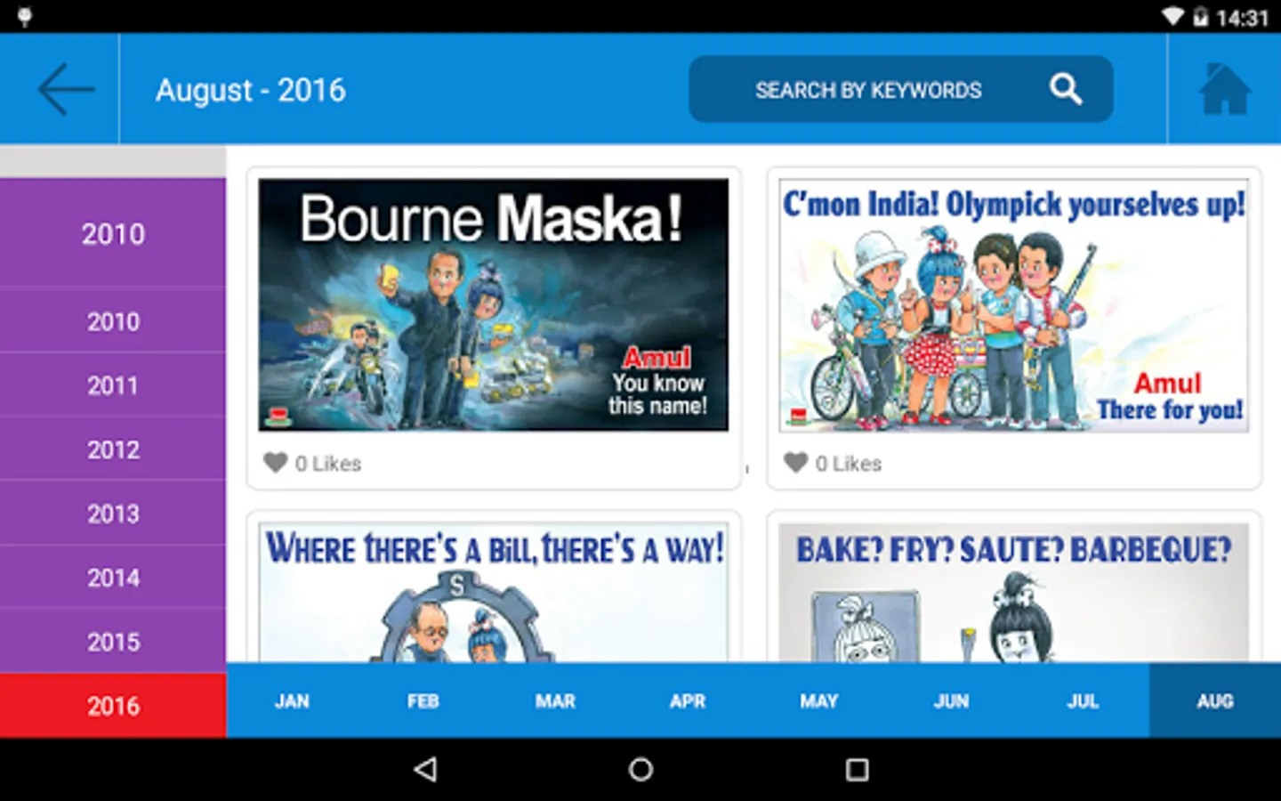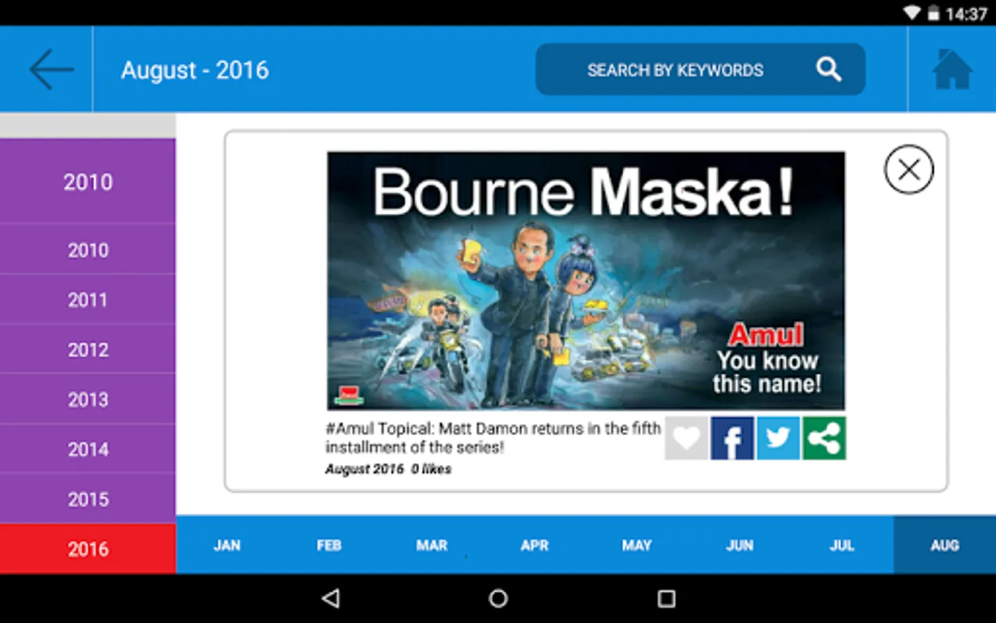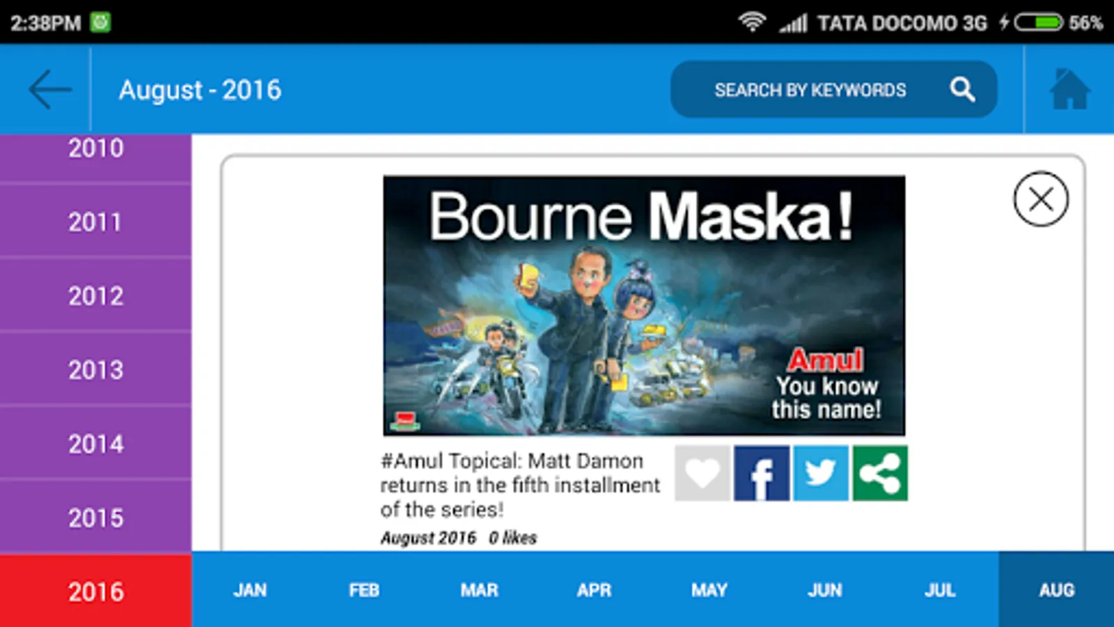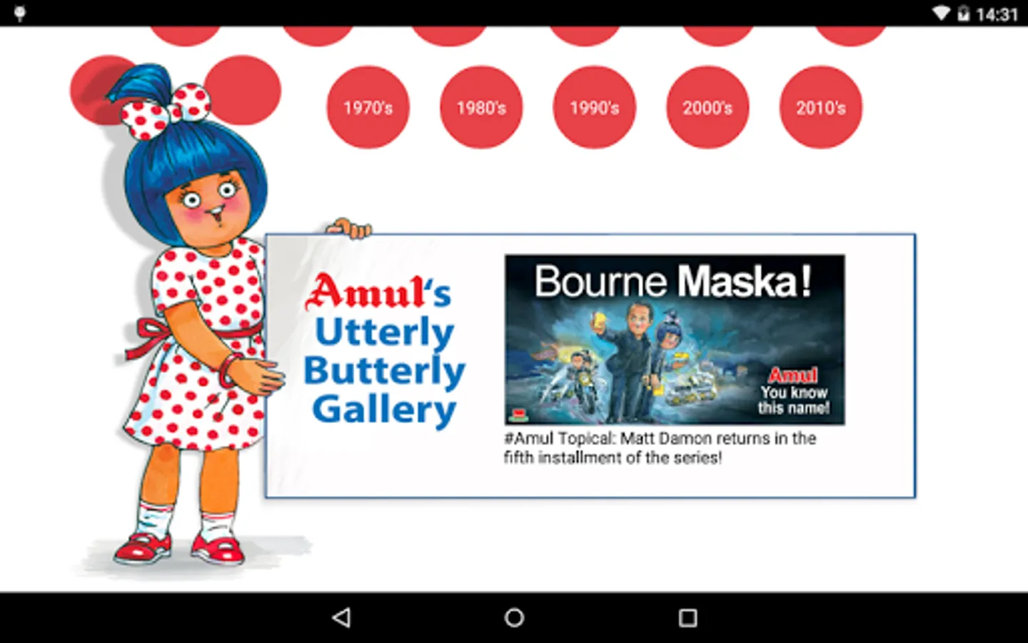 Amul World is an archive of the topical advertising. Since 1956, the endearing moppet, Amul girl with her tongue in cheek humour has been commenting on the popular political and social culture of India through the topicals and delighting generations of Indians. Amul World lets you view all these topicals that have been a part of the Amul advertising legacy and is updated real time with the latest topicals.