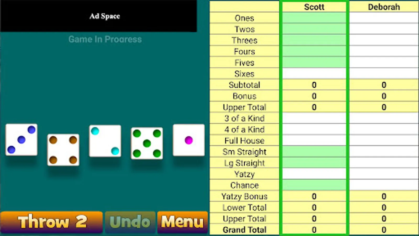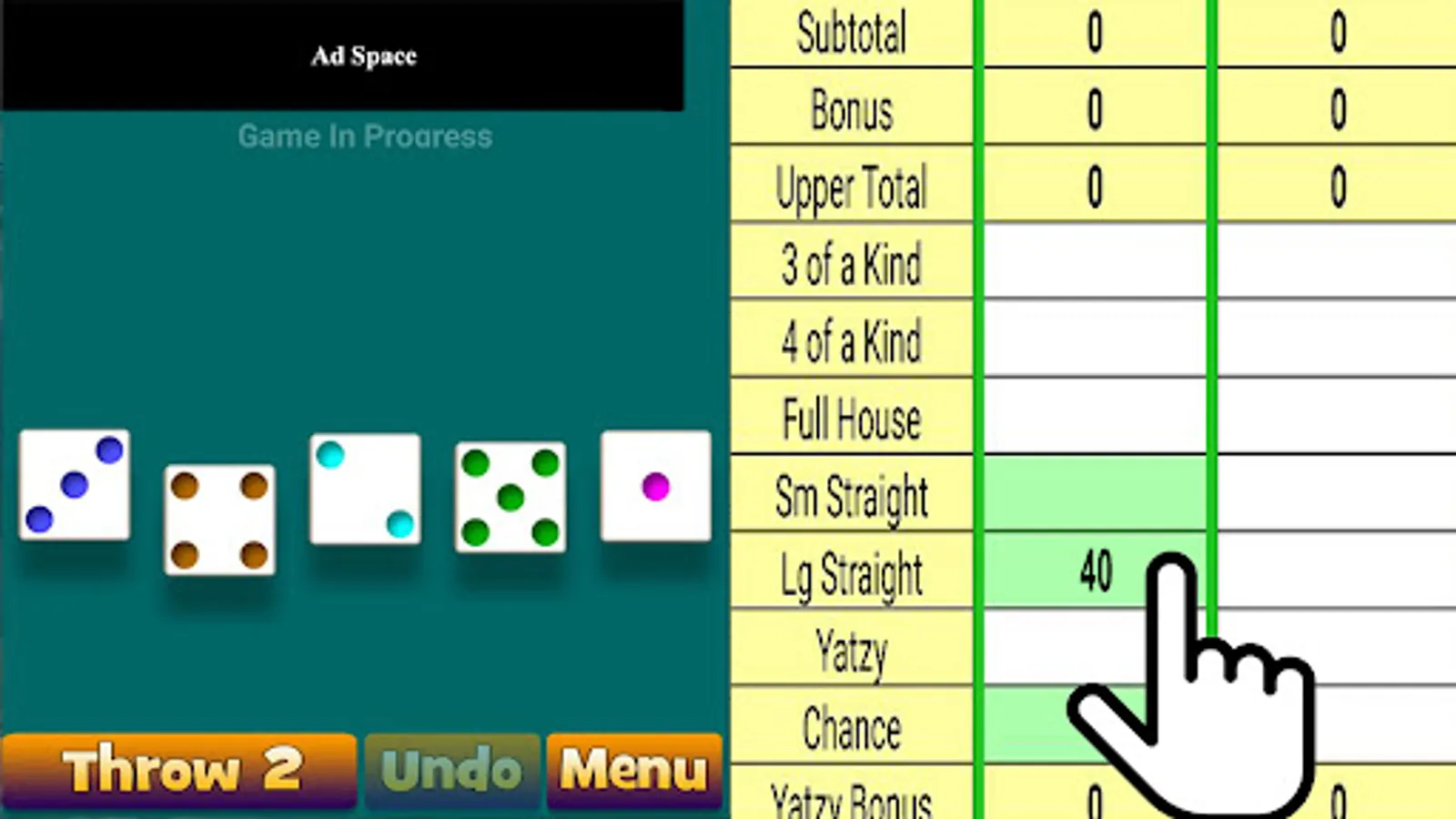 Normally, a phone screen is too small to display a Yatzy scorepad. But with our unique magnify feature, you can record your scores right on the scorepad. If you make a mistake, you can "Undo" and try again.