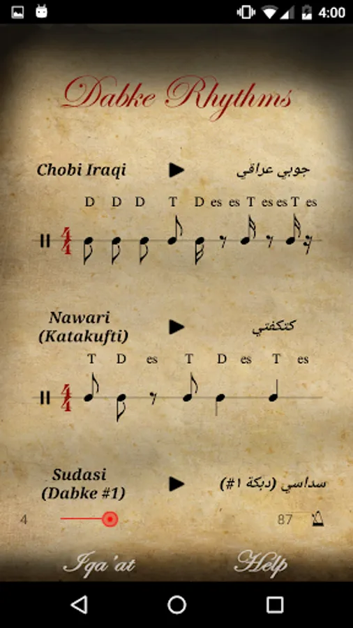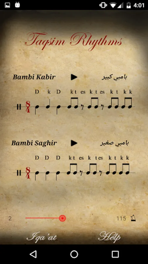 Note: - All the rhythms are showed and played in skeleton form, as the app goal is to learn the rhythms rather than playing rhythm with another instrument