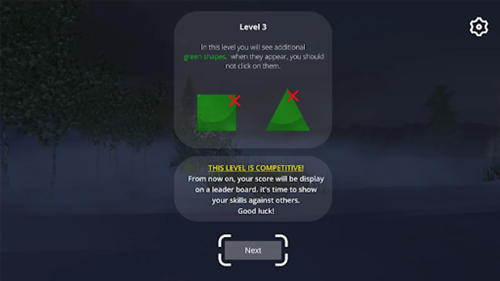Before each stage, the user will receive a short tutorial on the next stage of the game. The training will present him with the challenge, during which he will be given an example from the phase, to make sure he understands what he must do. In all