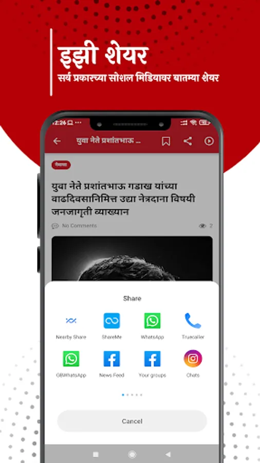 शेअरिंग - फेसबुक, व्हॉट्सअॅप, ट्विटर, ईमेल आणि बरेच काही वापरून तुमचे कुटुंब आणि मित्रांना लेख आणि व्हिडिओ पाठवू शकता.