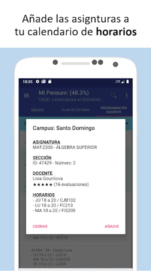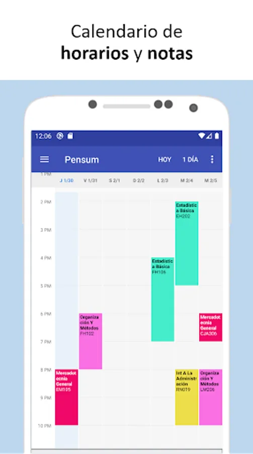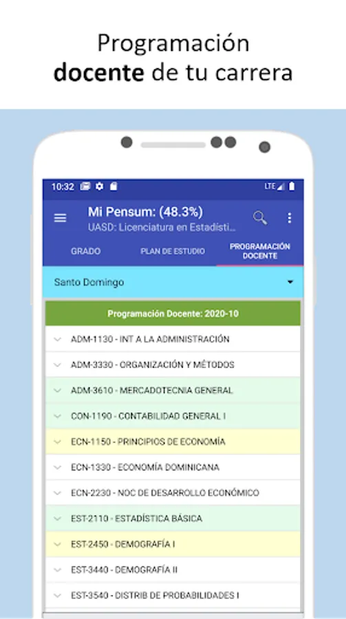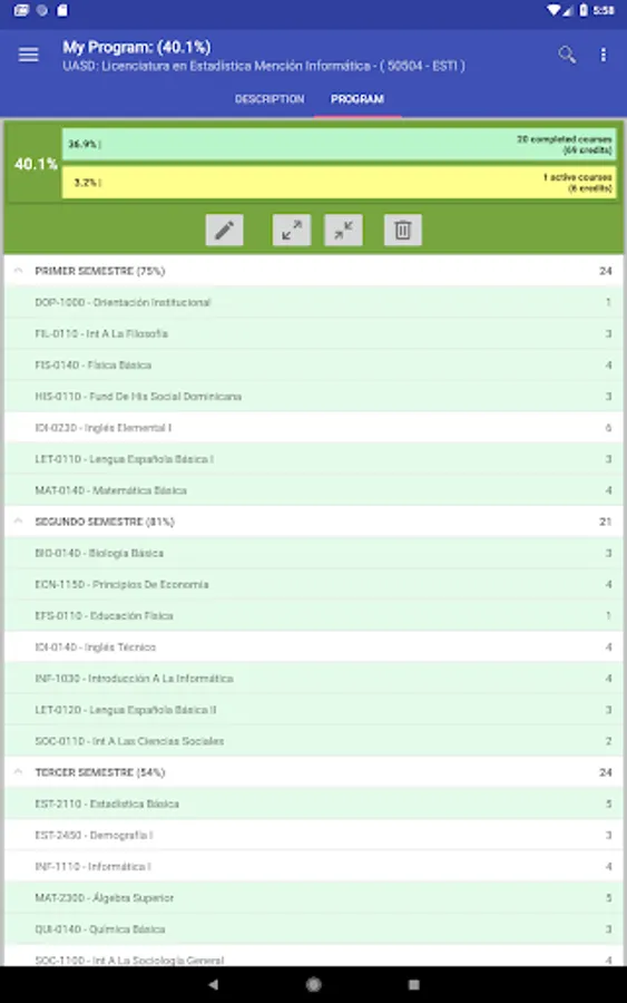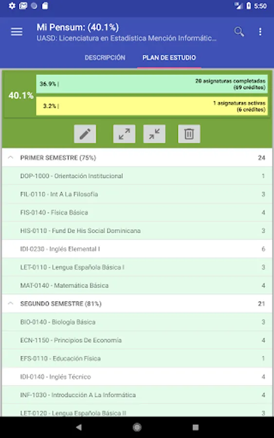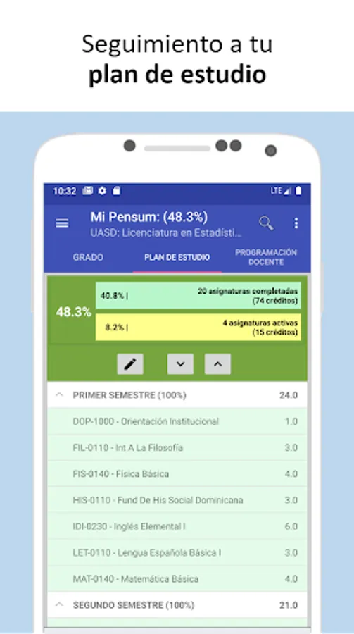 It allows you to select a study plan (program), specify if the courses are being studied or they have already been completed, the record of grades and schedules; which allows to display an average progress of the selected study plan. In addition you can see the progress achieved in other curricula in case of changing or choose another.