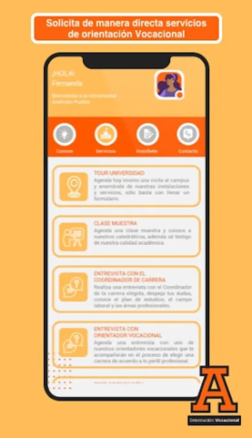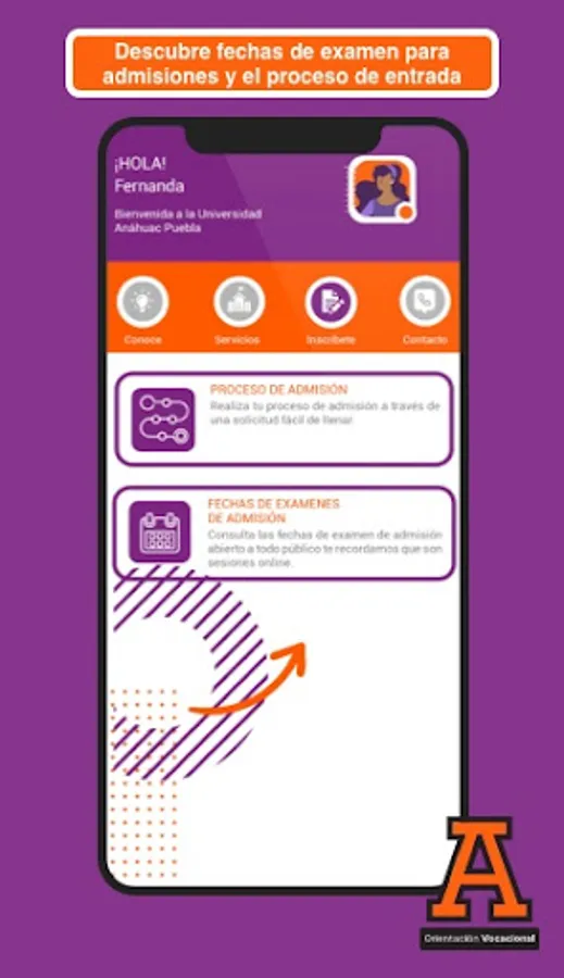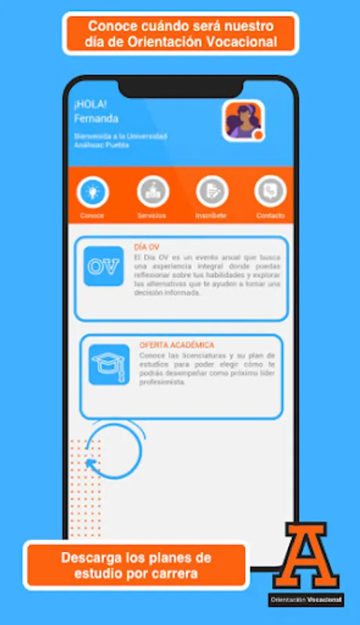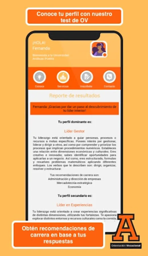 The application includes a Vocational Orientation Test that takes into account the interests, aptitudes, talents, strengths to discover your leadership style and the possible careers that you could study at the Anáhuac Puebla.