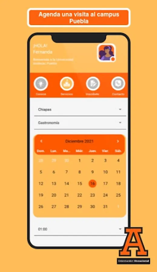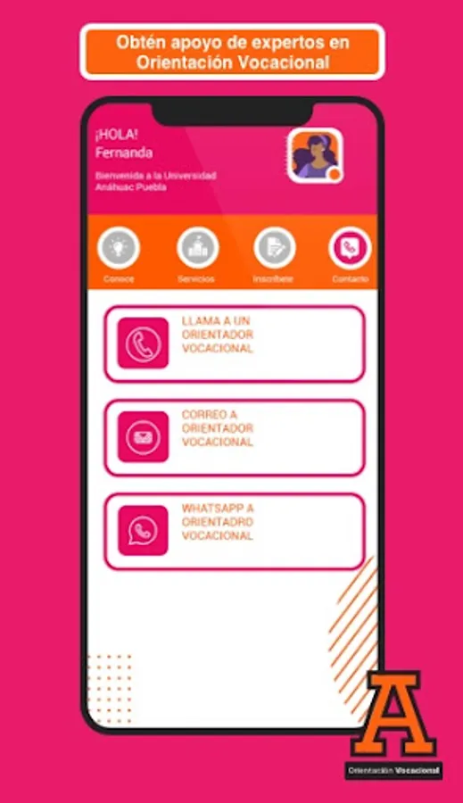 Likewise, the application has the option of directly contacting the Vocational Guidance area of the Universidad Anáhuac Puebla to carry out more in-depth studies on vocation, generate interviews with Career Coordinators and make appointments for a campus tour.