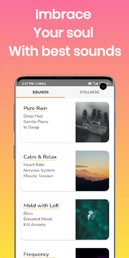 4. Surreal Soothing Sounds : After completing task you'll get exhausted, so we covered this for you by our unique sound collections where you will witness the most realistic and soothing sounds ever. From deep rain to frequency everything that is needed to enhance your mind is present in one spot.