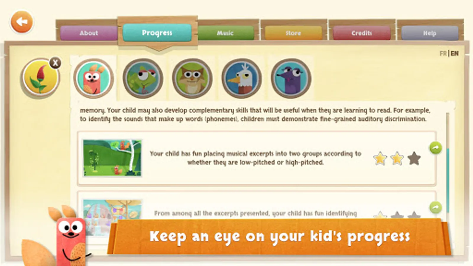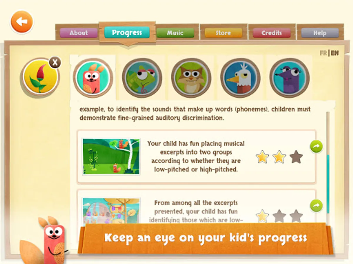 While playing, children visit five playful worlds and discover masterpieces of classical music. They improve musical, cognitive and social skills while exploring the fundamentals of music: pitch, tempo, intensity, timbre and harmony.