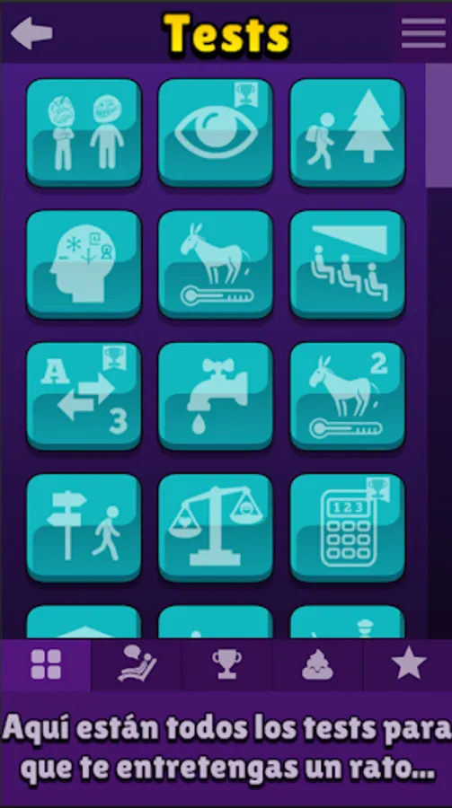 The app has a variety of tests, including personality/psychological tests, mental agility tests, absurd tests, knowledge tests and more
