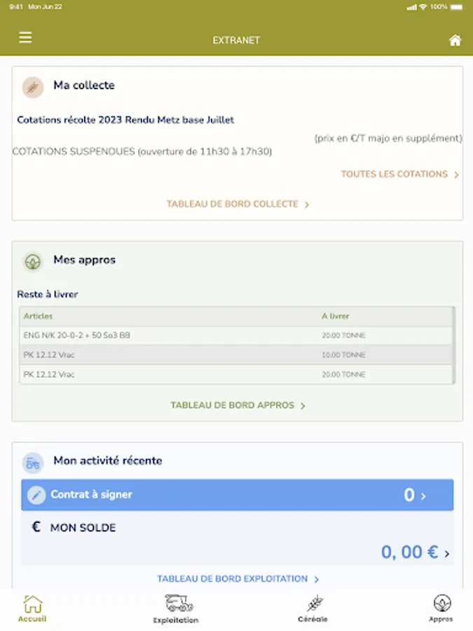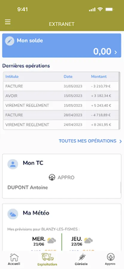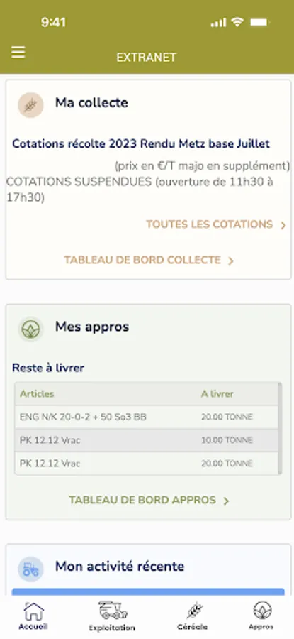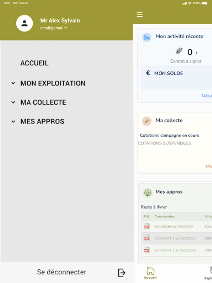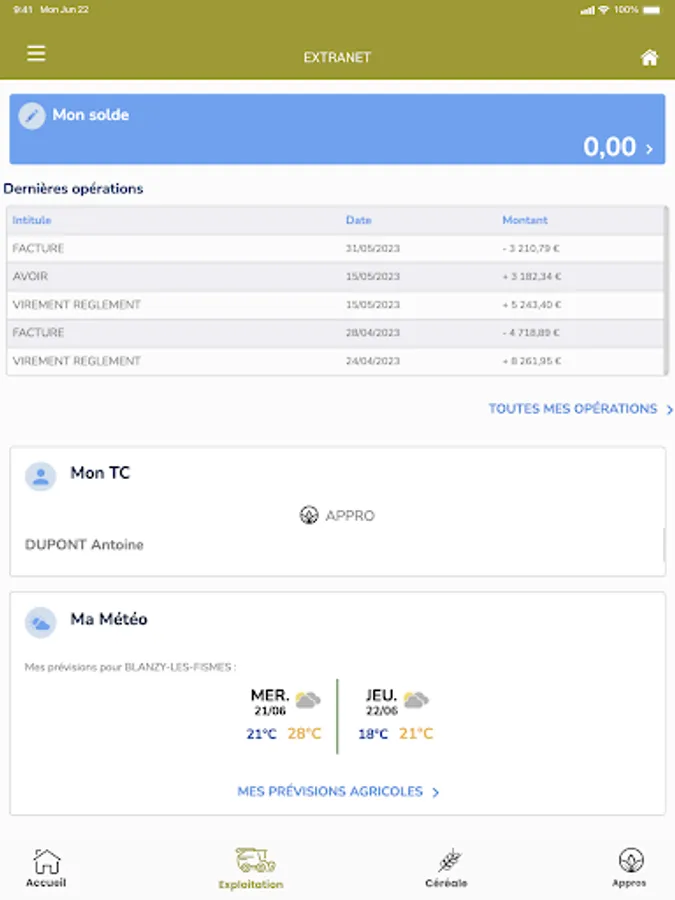 Thanks to the Agrifim mobile application, you can connect to your space to find all your account information and stay in touch with your agricultural trade. Here you will find the latest news from your Agrifim agricultural trade. You can also view the status of your accounts, the history of your contracts and orders. You will also be able to see your deliveries and your leftovers or even analyze the agricultural weather. Also find the MSDS of your ordered products as well as your quotations.
