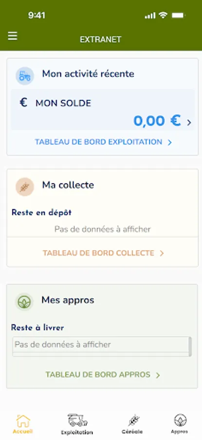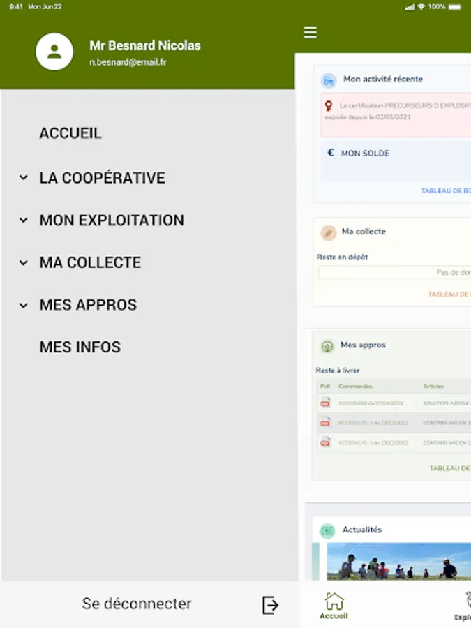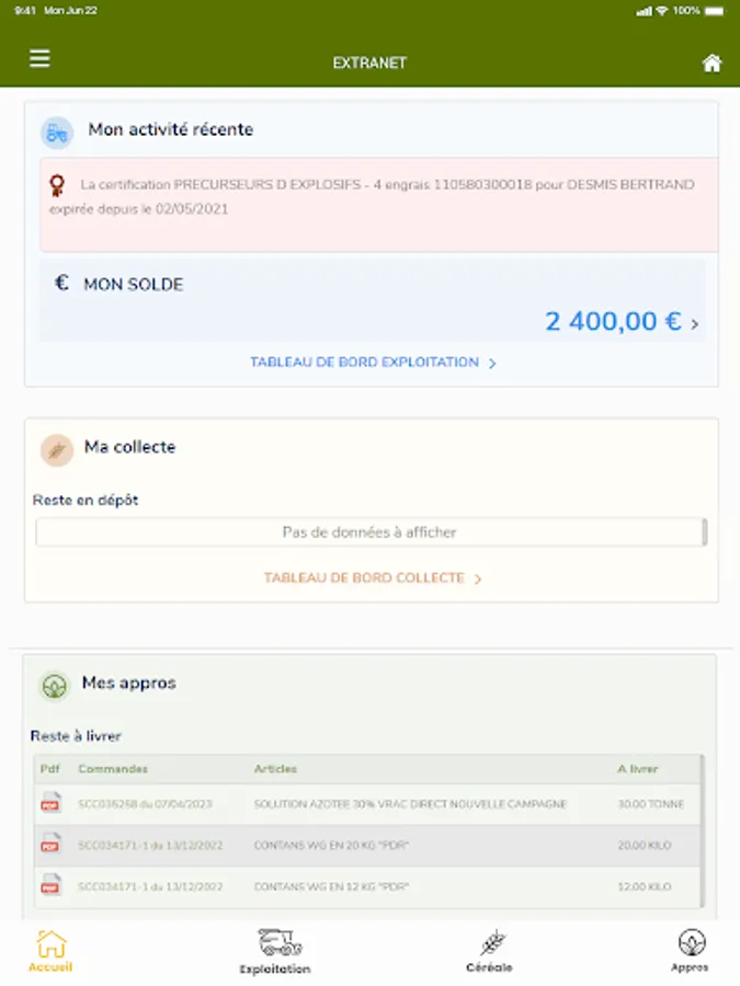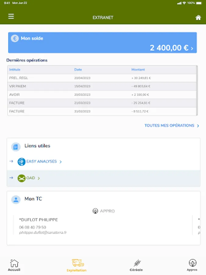 Thanks to the Sana Terra mobile application, you can connect to your space to find all your account information and stay in touch with your cooperative. Here you will find the latest news from the Sana Terra cooperative. You can also view the status of your accounts, the history of your contracts and orders. You will also be able to see your deliveries and your leftovers or even analyze the agricultural weather. Also find the MSDS of your ordered products.
