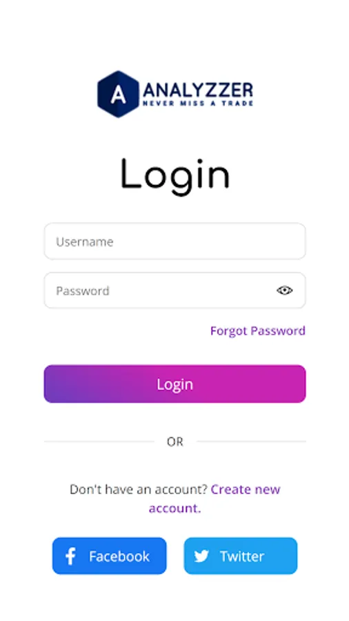 You can have access to the app through the Login Page, using the credentials (Username and Password) from your account at the website analyzzer.com or you can create a new account through the app.