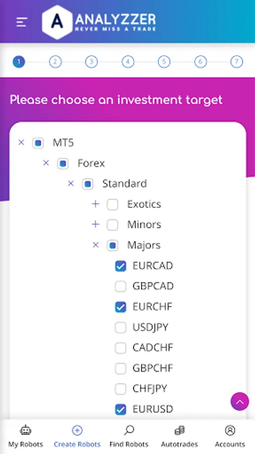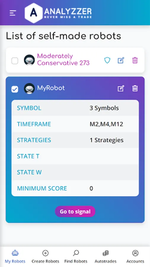 Through the Settings tab you can filter the signals by Market (Forex, Indices and Commodities) and Profile. Profiles can be created only at the analyzzer.com website.