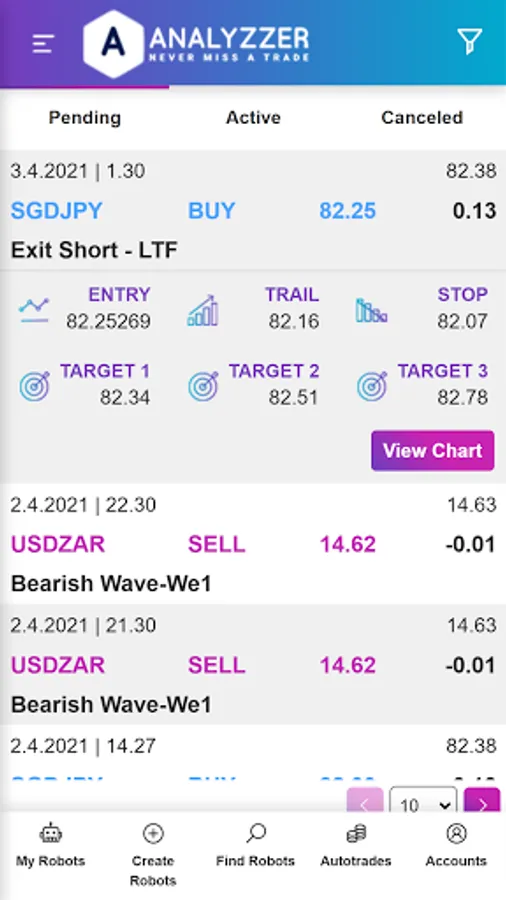 As Pending, you can view the signals that were broadcasted and are also available at the analyzzer.com web site, with all the necessary details such as Inception Date and Time, Instrument, Direction, Timeframe, Entry, Stop 2, Stop 1, Target 1, Target 2 and Target 3 Levels, Current Price, Status (Pending or Get Ready) and the distance in pips from the entry level.